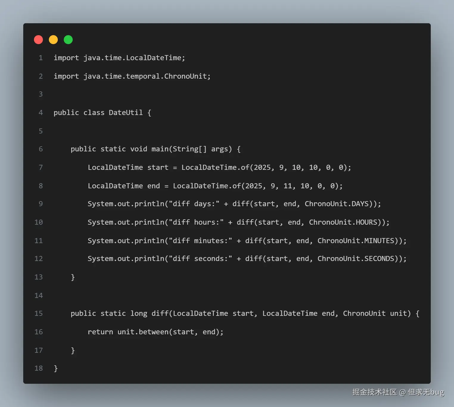 日常开发中,经常会存在这么一个场景,给定两个时间,计算两者相差多少天、小时、分钟或秒。
