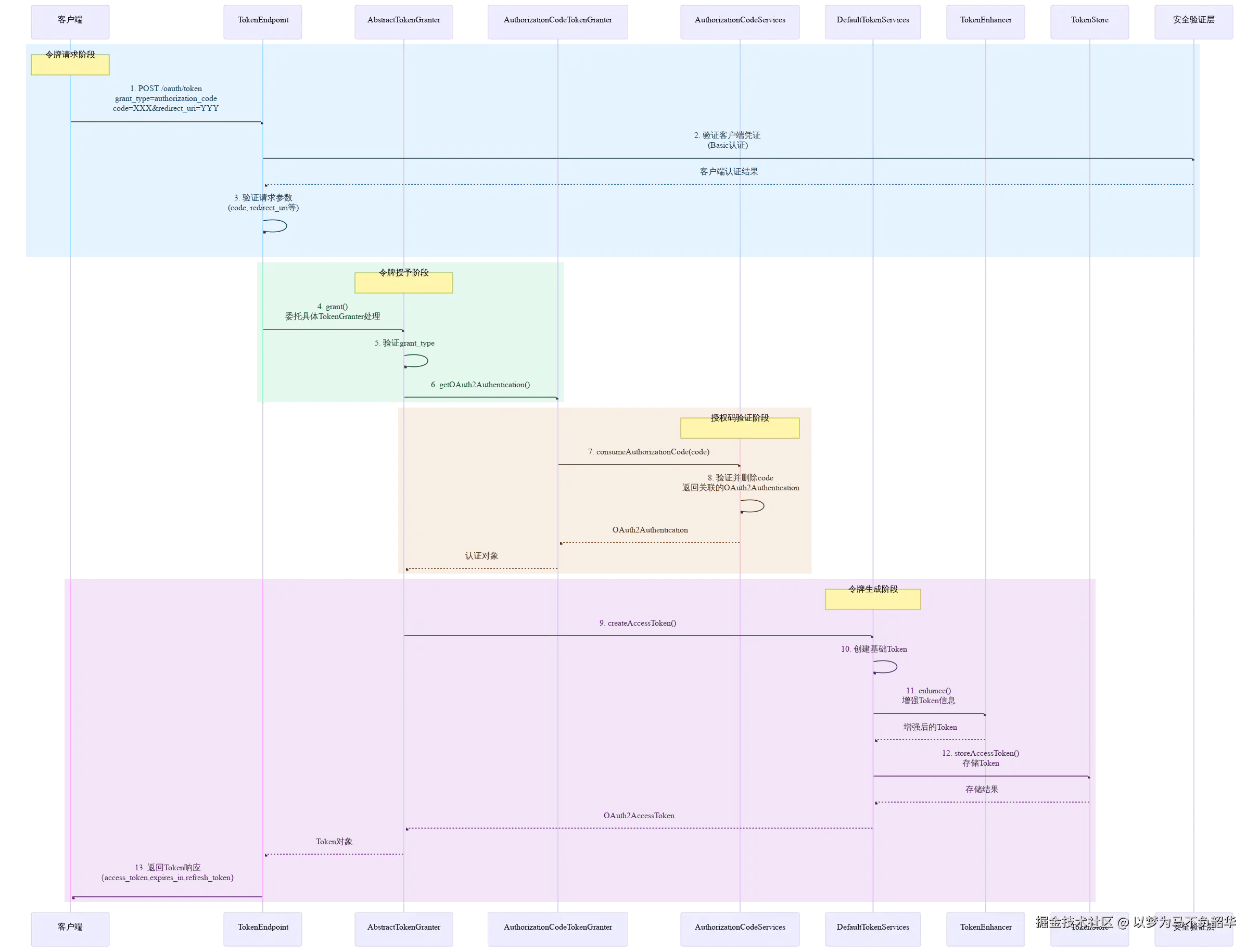 以下是基于OAuth2授权码模式中客户端使用授权码获取访问令牌的完整时序图,包含了关键步骤和逻辑补充: