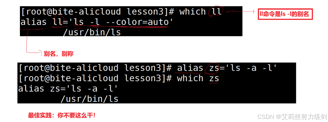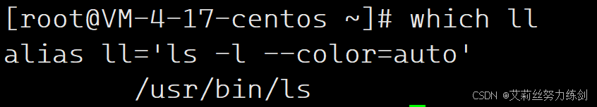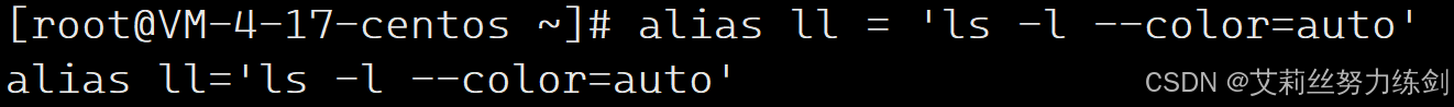 alias(别名)和C++里面的引用(取别名)很类似,这里就是用alias来把 ll 变成 ls -l 的别名,ls -l --color=auto中的。具体我们后面会介绍。