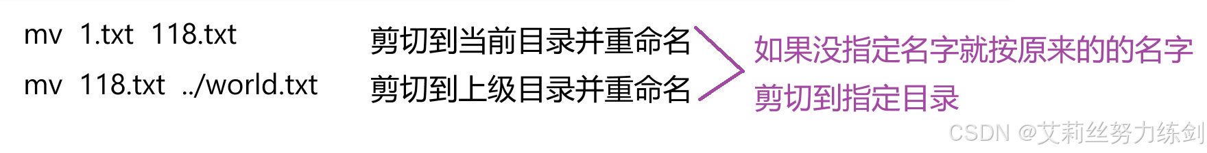 (2)当第二个参数类型是文件时,mv命令完成文件重命名,此时,源文件只能有一个(也可以是源目录名),它将所给的源文件或目录重命名为给定的目标文件名。