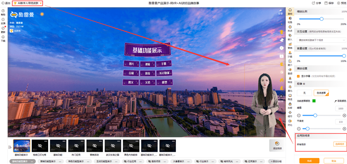 【AI数字人皮肤】、【嵌入视频】新增应用到场景功能,支持用户自主选择将数字人皮肤或是嵌入的视频应用到所选场景中,位置交互设置等可灵活设置。