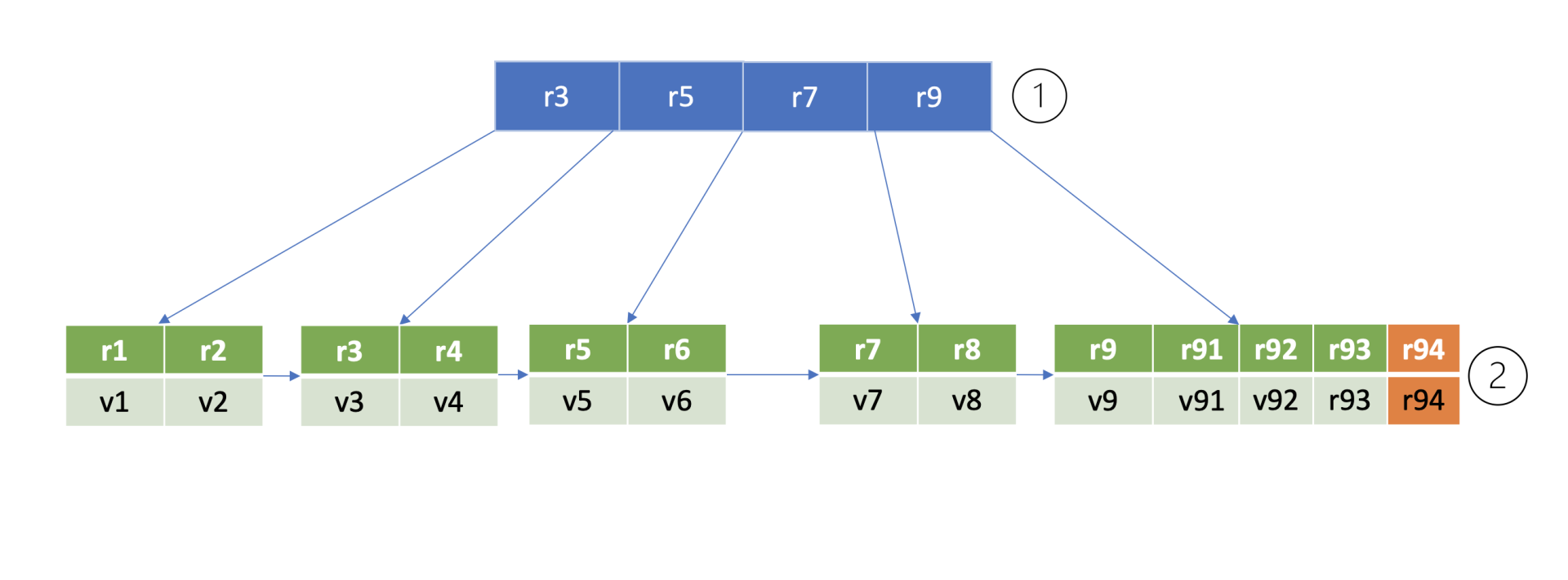 首先从上面put案例中我们可以看到,插入了一个新的元素在B+ tree的叶子节点,它可能已不满足B+ tree的特性,因此事务提交时,第一步首先要调整B+ tree,进行重平衡、分裂操作,使其满足B+ tree树的特性。上面案例里插入一个key r94后,经过重平衡、分裂操作后的B+ tree如下图所示。