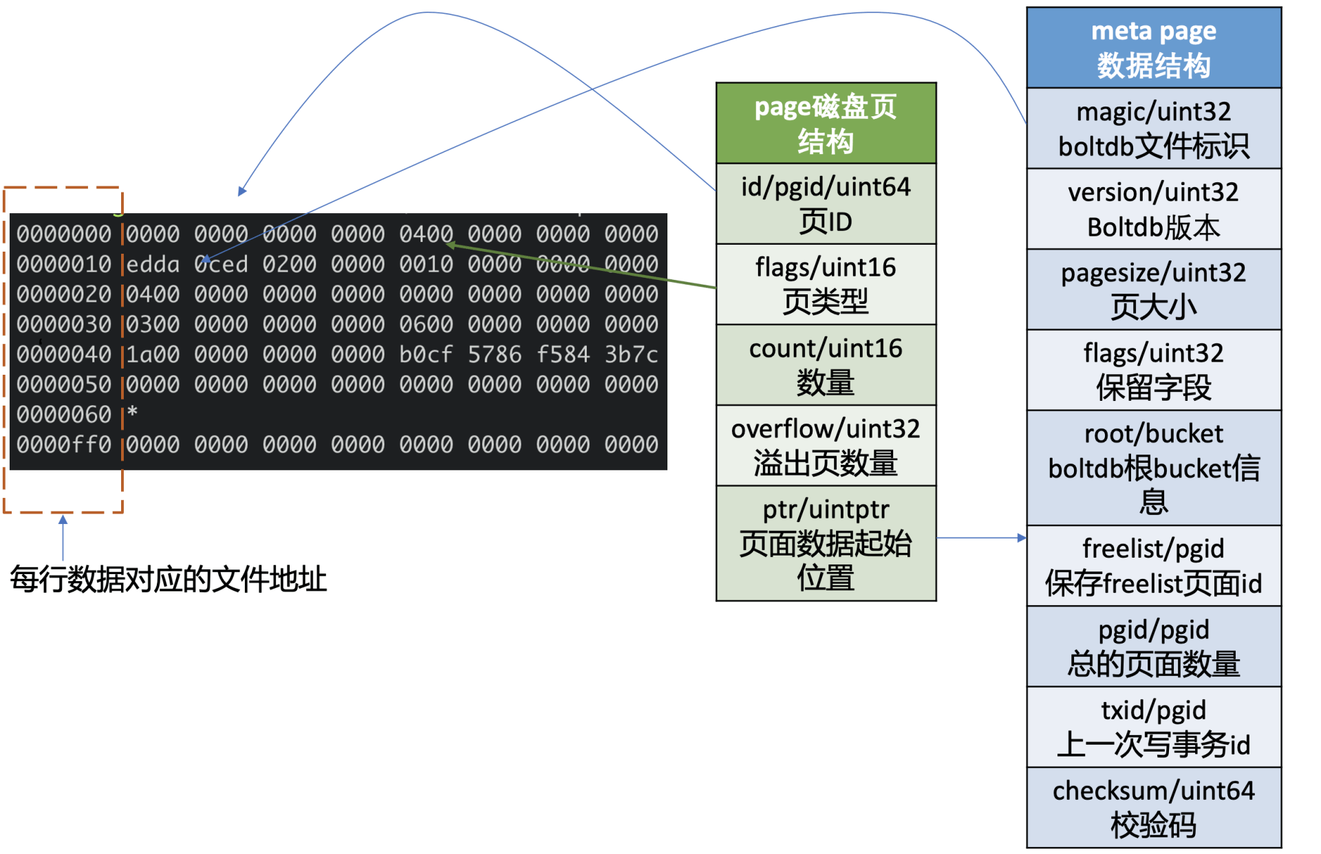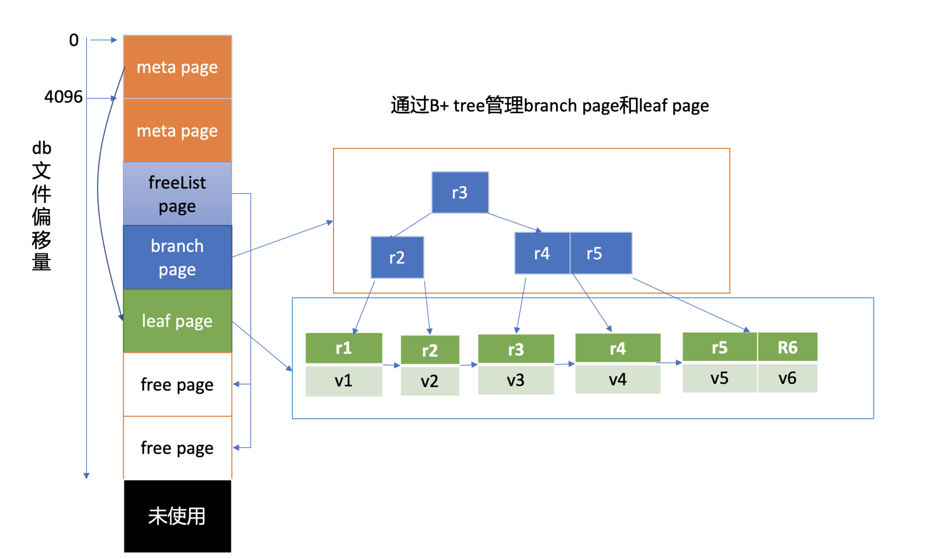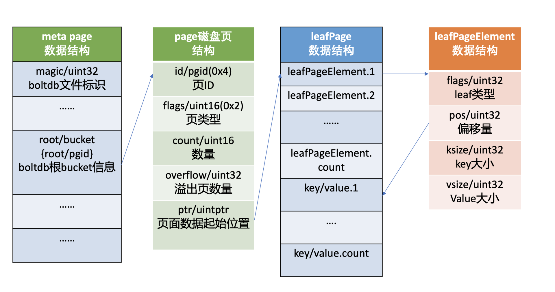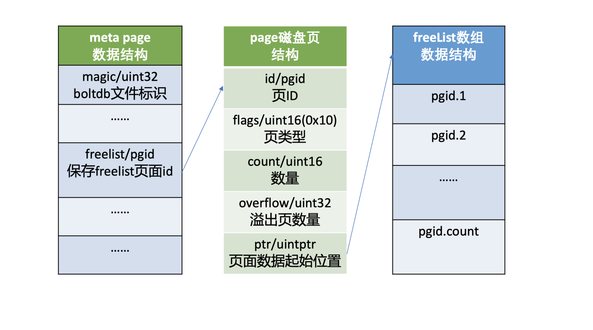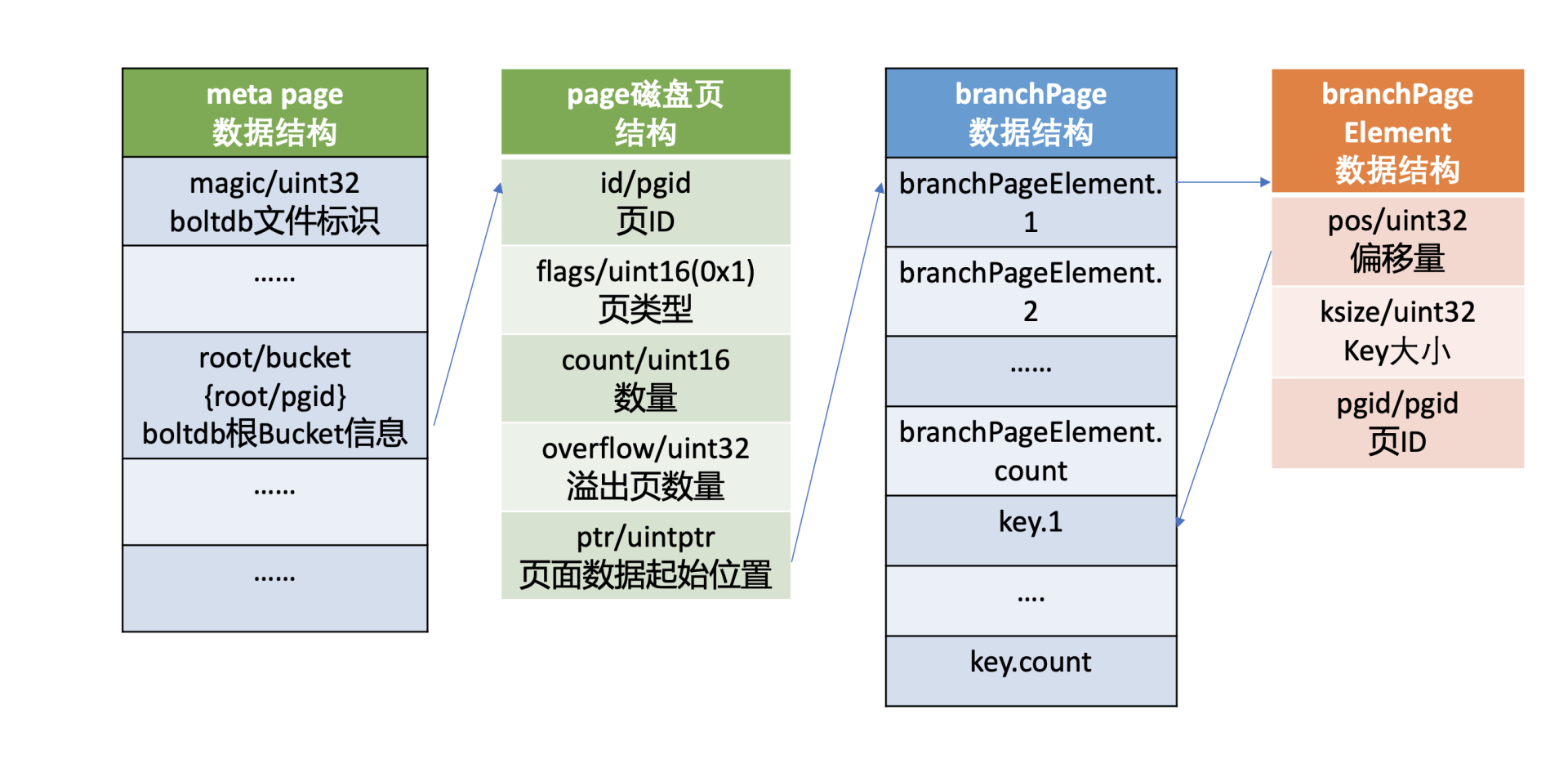 上节课我们介绍boltdb实现时,提到过boltdb将db文件划分成若干个page页,page页又有四种类型,分别是meta page、branch page、leaf page以及freelist page。branch page保存B+ tree的非叶子节点key数据,leaf page保存bucket和key-value数据,freelist会记录哪些页是空闲的。