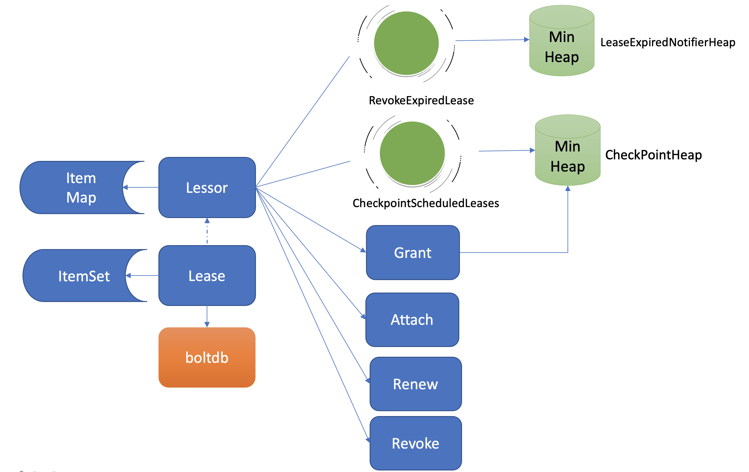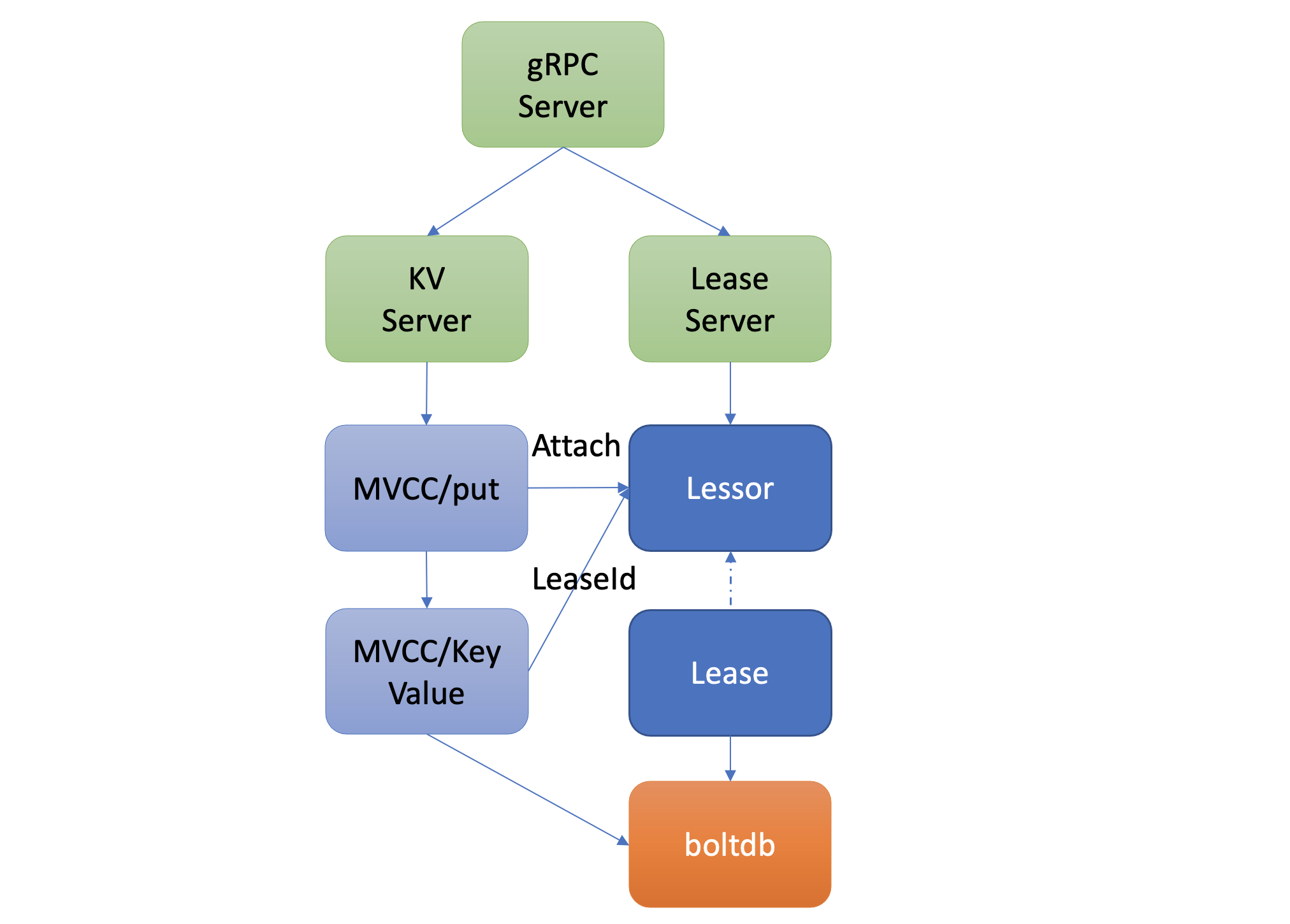 以上流程原理如下图所示,它描述了用户的key是如何与指定Lease关联的。当你通过put等命令新增一个指定了"--lease"的key时,MVCC模块它会通过Lessor模块的Attach方法,将key关联到Lease的key内存集合ItemSet中。