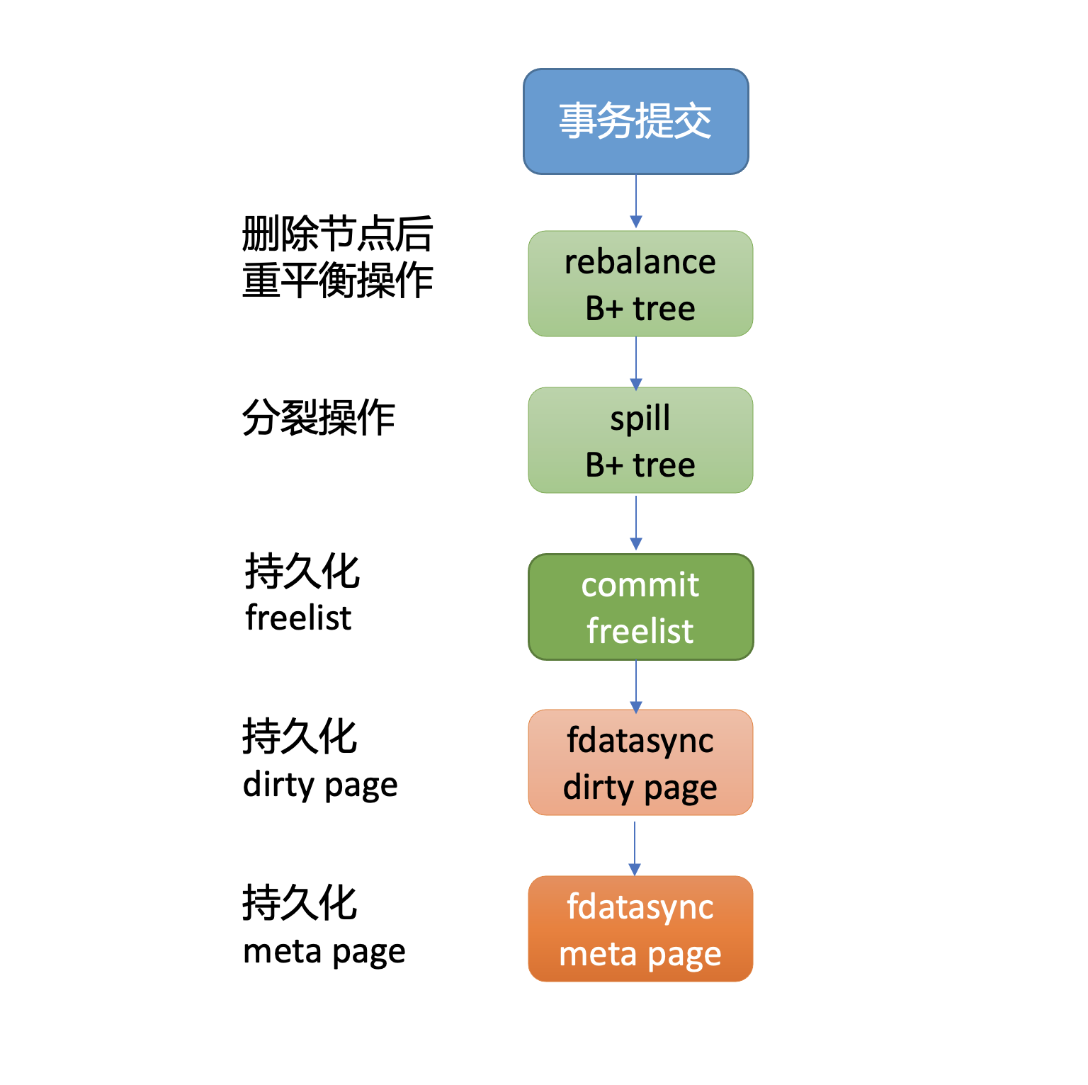 在重平衡、分裂过程中可能会申请、释放free page,freelist所管理的free page也发生了变化。因此事务提交的第二步,就是持久化freelist。
