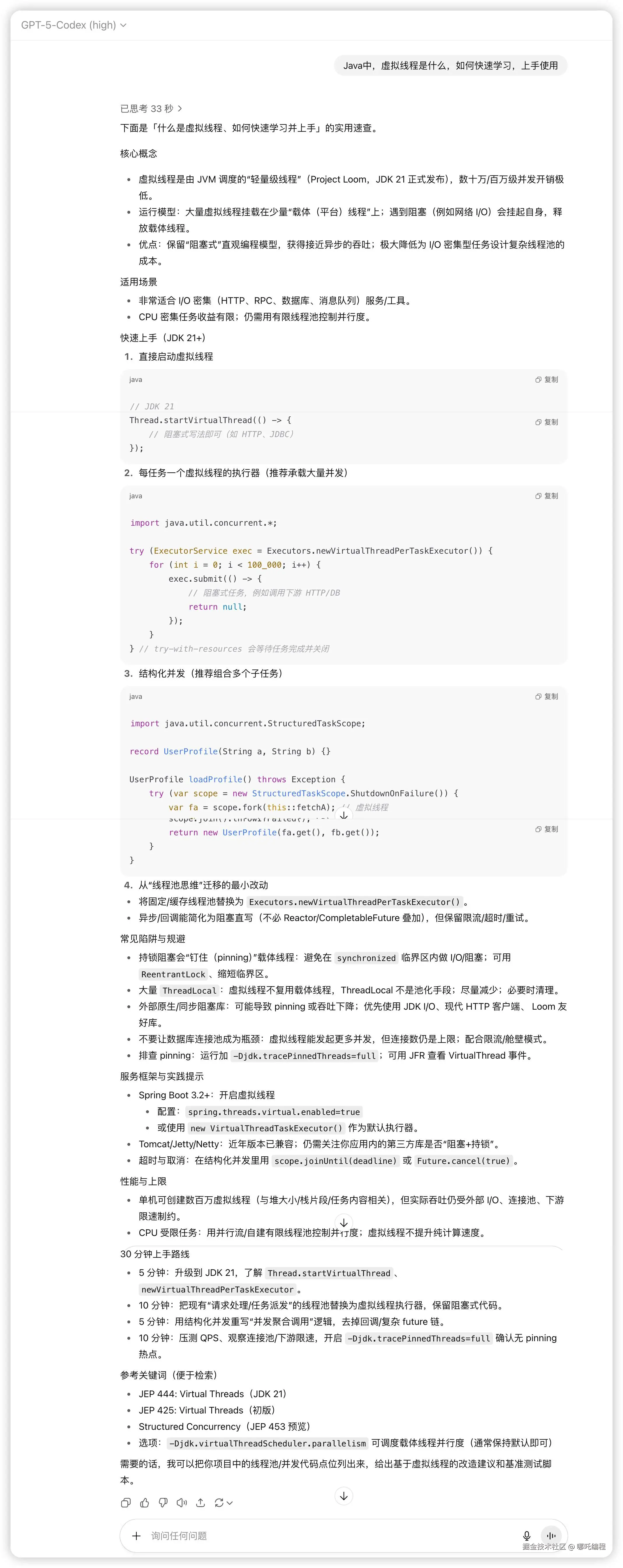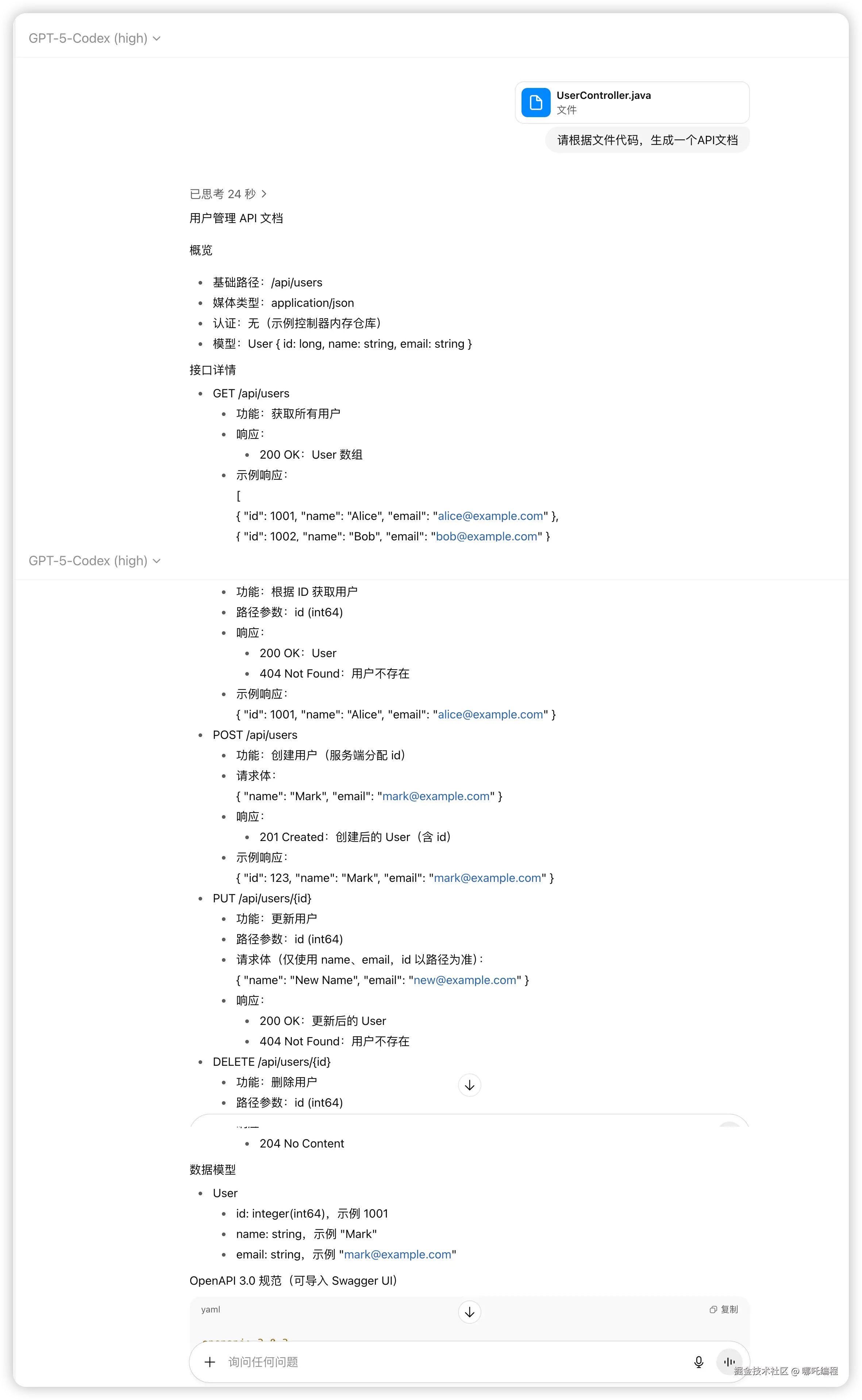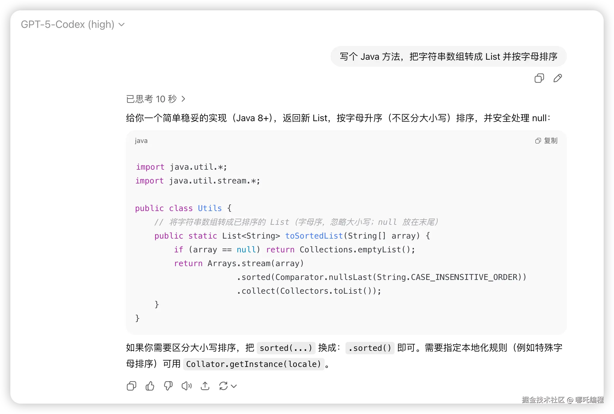 你只要说出需求,比如:"写个 Java 方法,把字符串数组转成 List 并按字母排序",GPT-5 Codex 立刻能生成完整代码,还能自动加上注释,甚至告诉你为什么这么写。