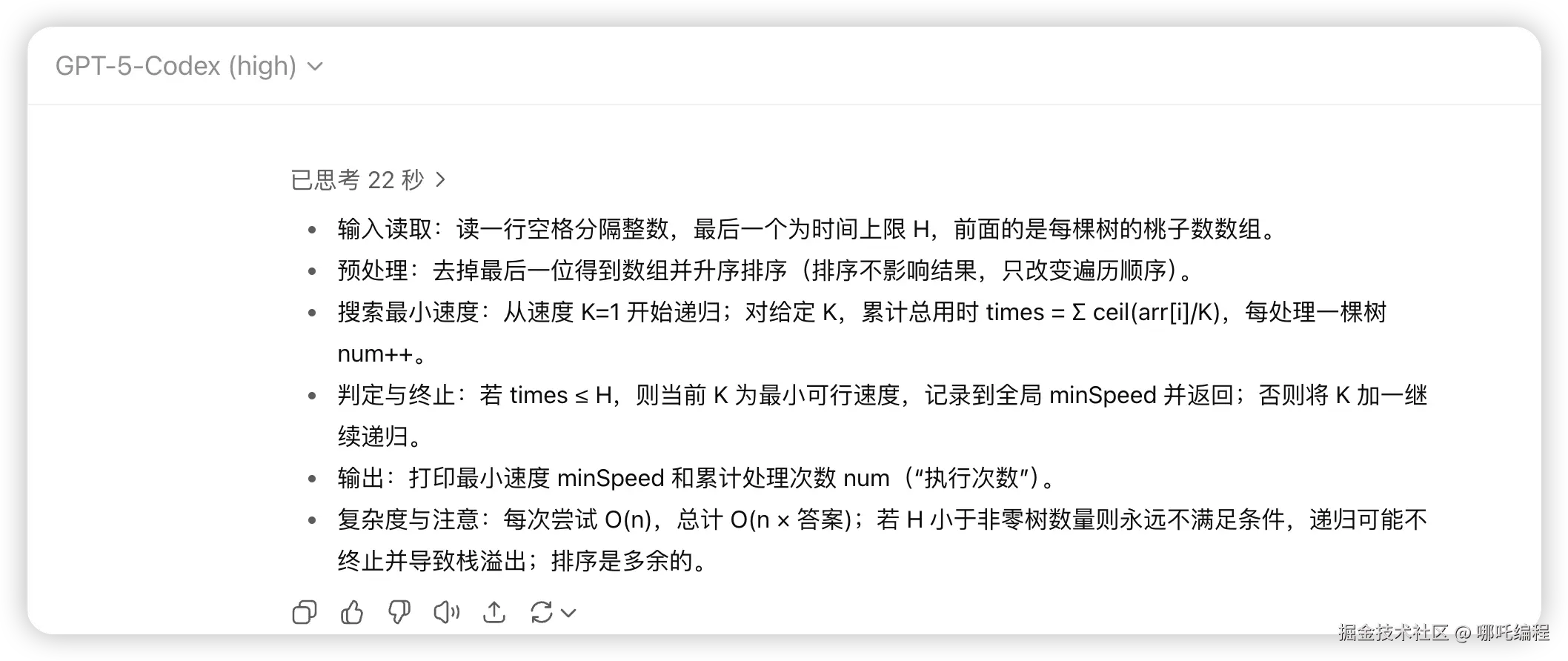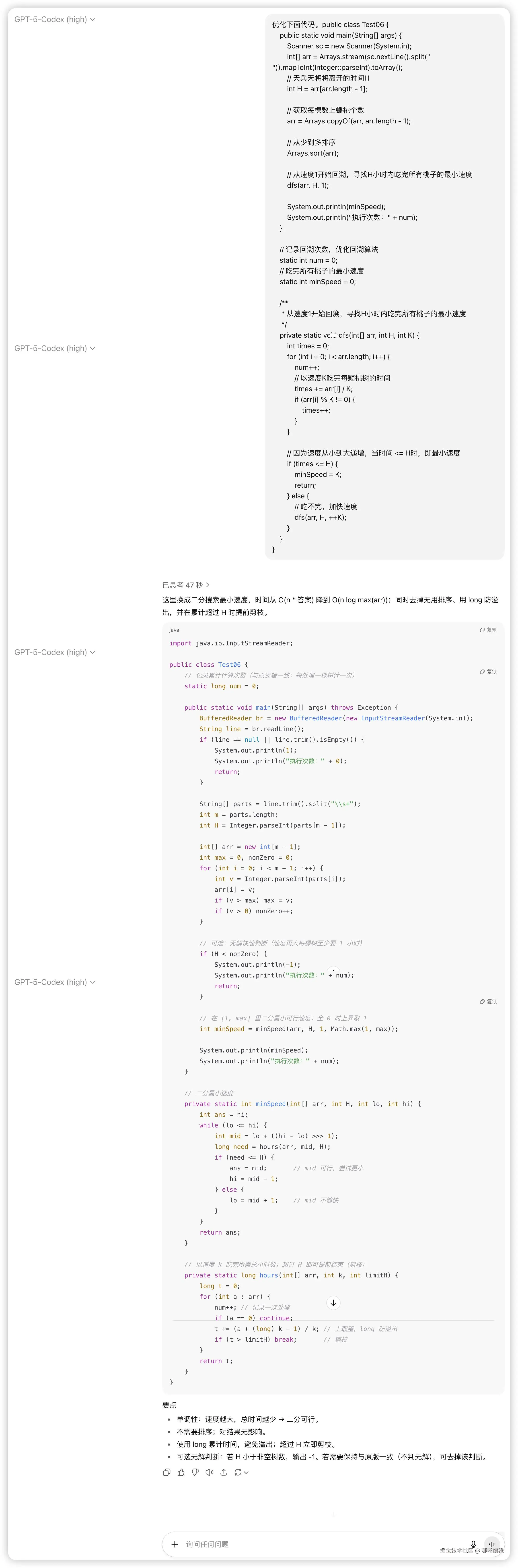 GPT-5 Codex推荐换成二分搜索最小速度,时间从 O(n * 答案) 降到 O(n log max(arr));同时去掉无用排序、用 long 防溢出,并在累计超过 H 时提前剪枝。