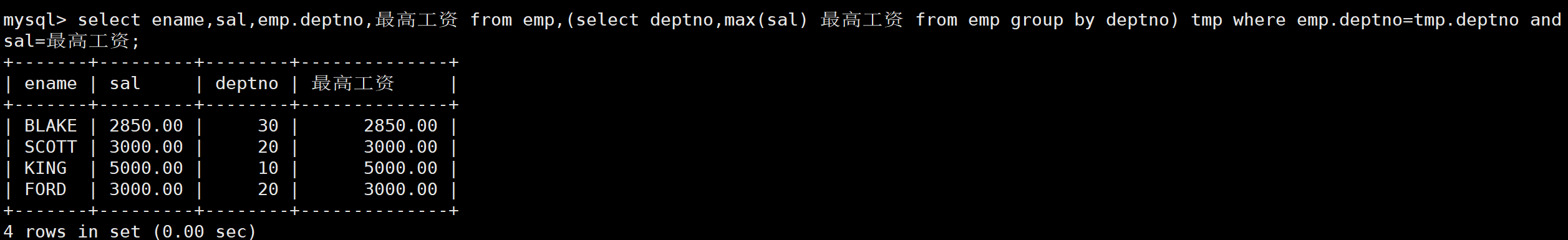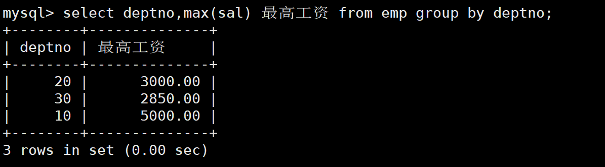先查询每个部门的最高工资。如下: