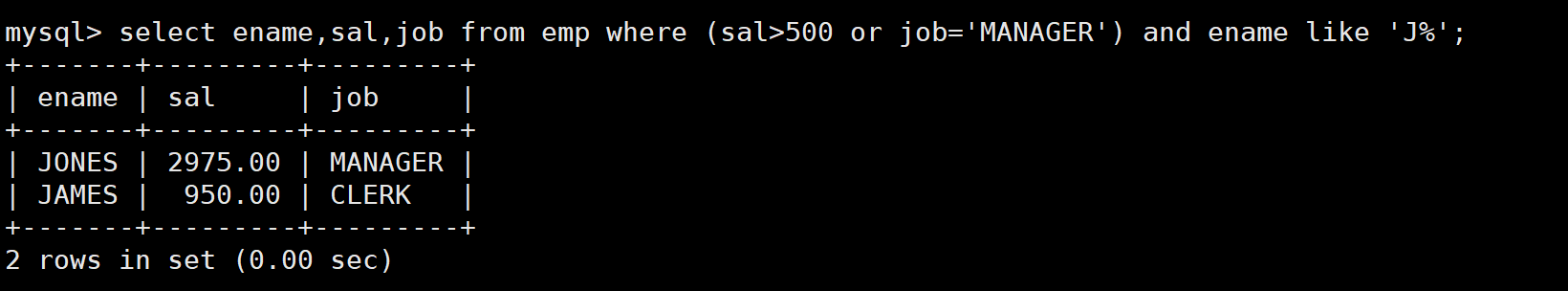 查询工资高于500或岗位为MANAGER的员工,同时要求员工姓名的首字母为大写的J