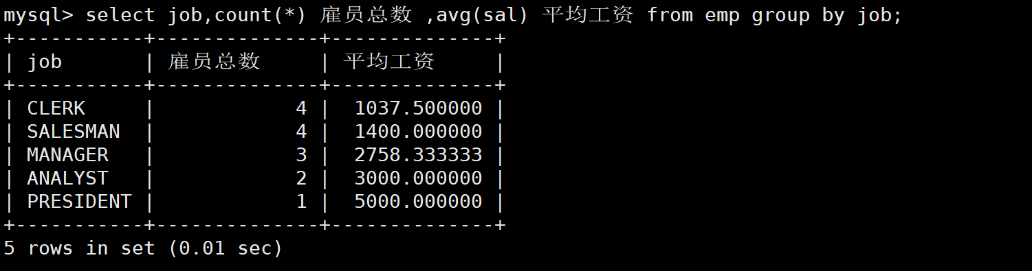 查询每种岗位的雇员总数和平均工资