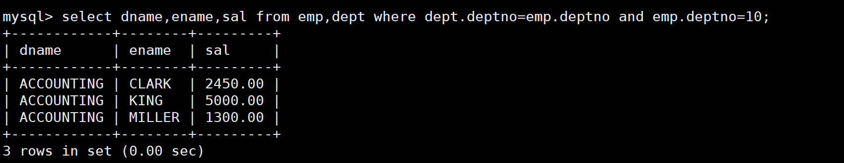 这里我们首先要分析需求,看看需要显示的都在哪些表中,在这里部门名这个信息在部门表中,而其他信息在员工表中,所以我们需要将两张表联系起来,然后再进行条件筛选,因为做完笛卡尔积后会产生一些无效数据,我们要将无效数据剔除。