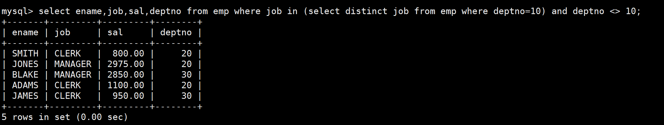 in关键字:显示和10号部门的工作岗位相同的员工的名字、岗位、工资和部门号,但是不包含10号部门的员工