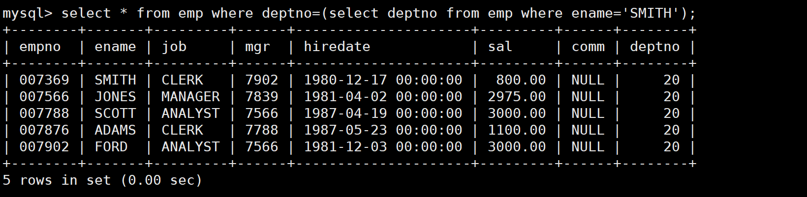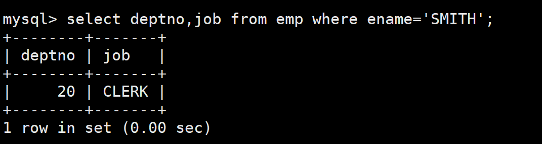 先查询SMITH所在部门的部门号和他的岗位。如下: