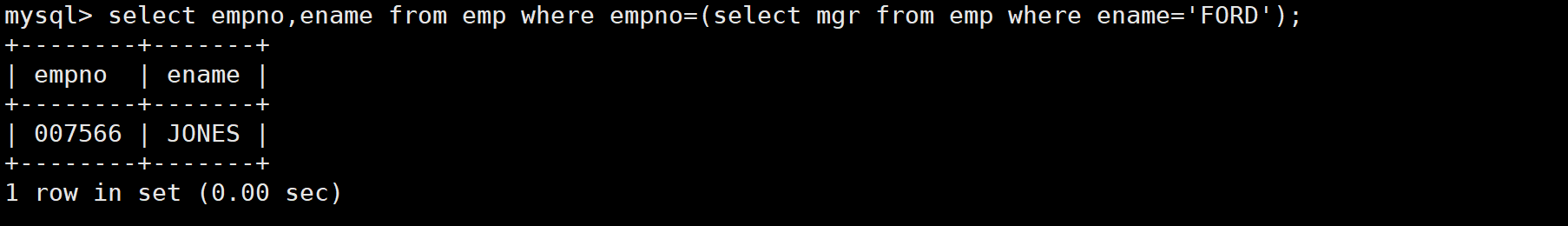 解决该问题可以使用子查询,先对员工表进行查询得到FORD的领导的编号,然后再根据领导的编号对员工表进行查询得到FORD领导的姓名。如下: