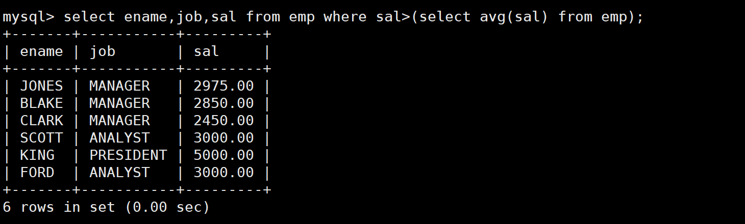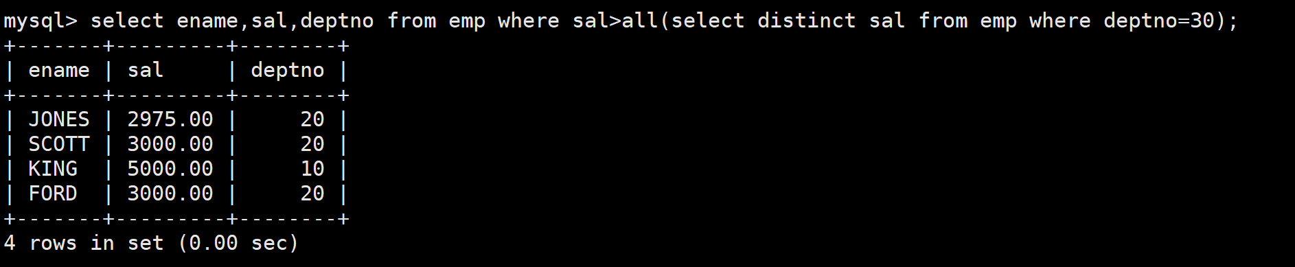 - 多列子查询返回的如果是多行数据,在筛选数据时也可以使用in、all和any关键字。