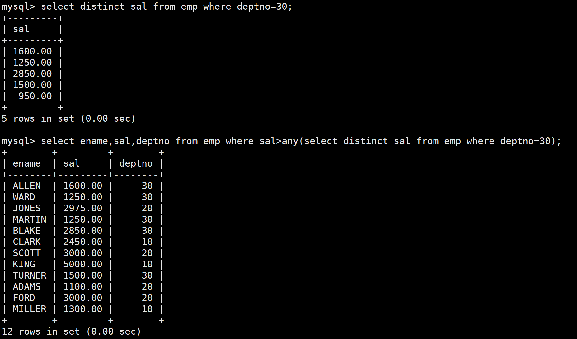 先查询30号部门员工的工资,然后在查询员工表时在where子句中使用any关键字,判断员工的工资是否高于子查询的得到的工资中的某一个,如果是则符合筛选条件。如下: