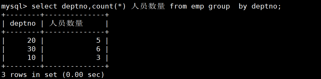 在group by子句中指明按照部门号进行分组,分别查询每个部门的人员数量。如下: