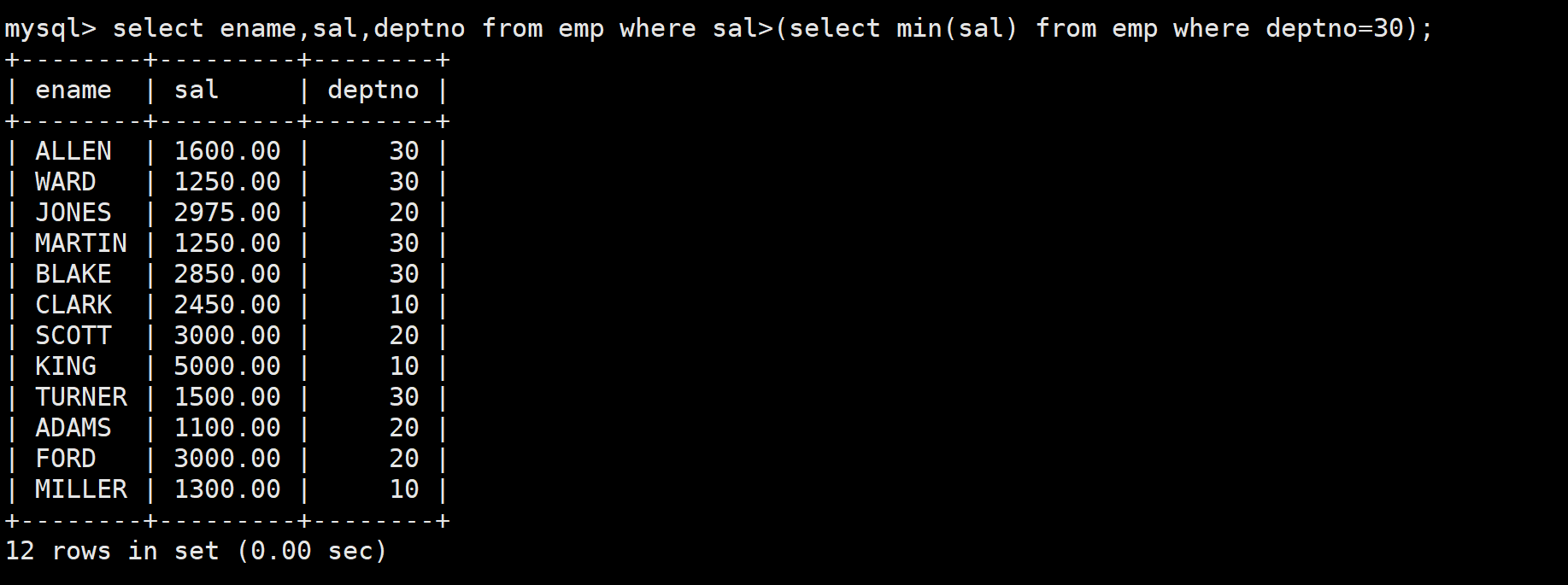 但实际这道题也等价于找到工资高于30号部门的最低工资的员工,因此也可以使用单行子查询得到30号部门的最低工资,然后判断员工的工资是否高于子查询得到的最低工资即可,由于要求筛选出来的员工包含30号部门的,因此不需要再对部门号进行过滤。如下: