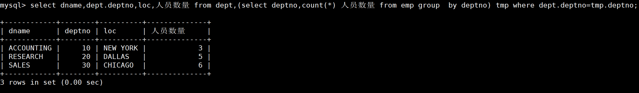 说明一下: 在from子句中使用子查询时,必须给子查询得到的临时表取一个别名,否则查询将会出错。
