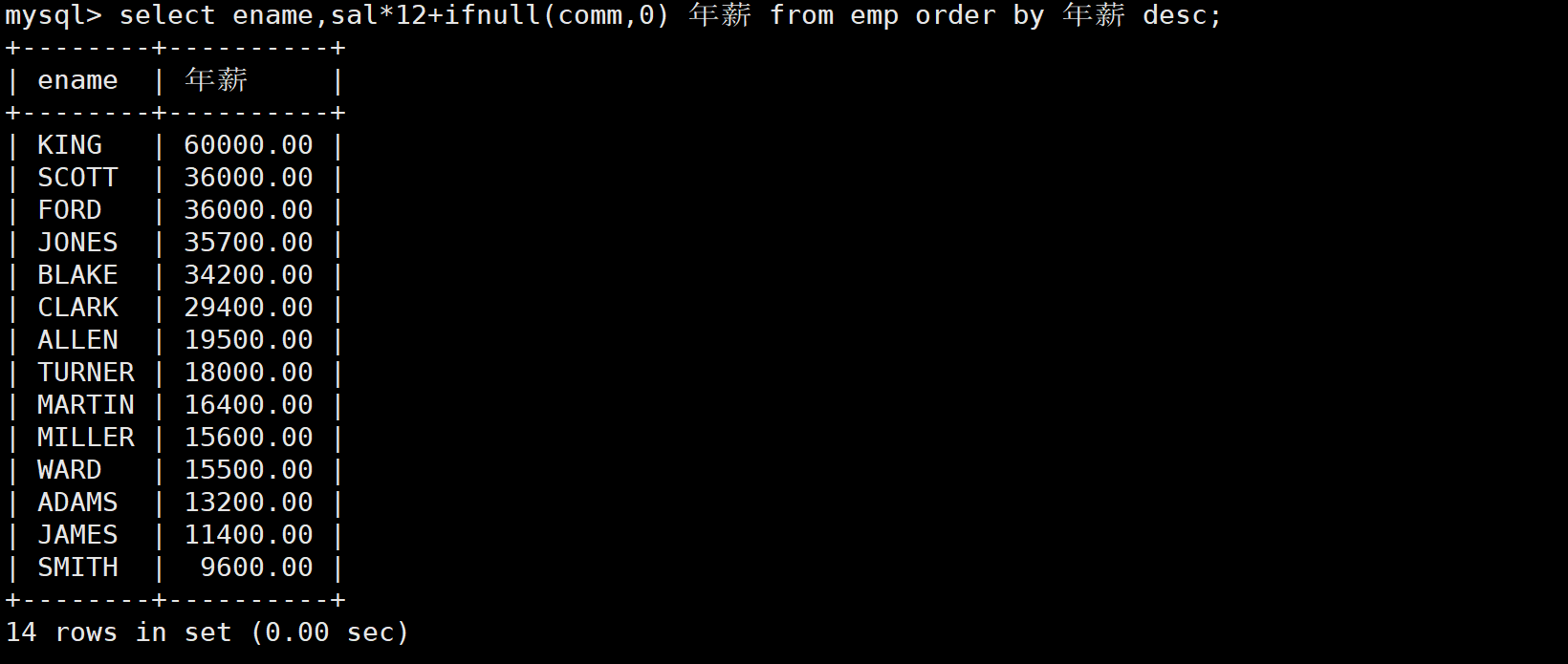 这里需要注意的就是奖金(comm)可能为NULL,MySQL中NULL是不参与运算的,所以这就可能导致最终年薪为NULL的情况,这时就需要使用ifnull函数来判断一下。