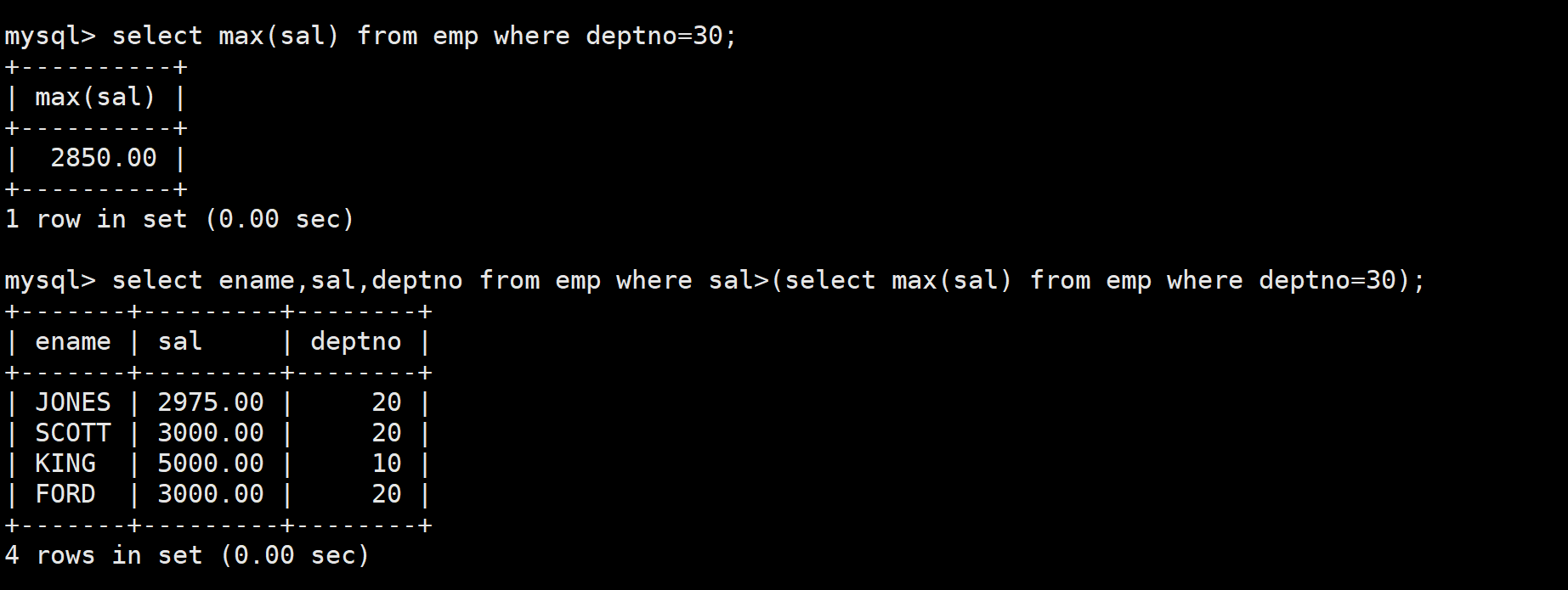 本题其实可以等价于求工资高于30号部门的最高工资的员工,可以使用单行子查询来解决;