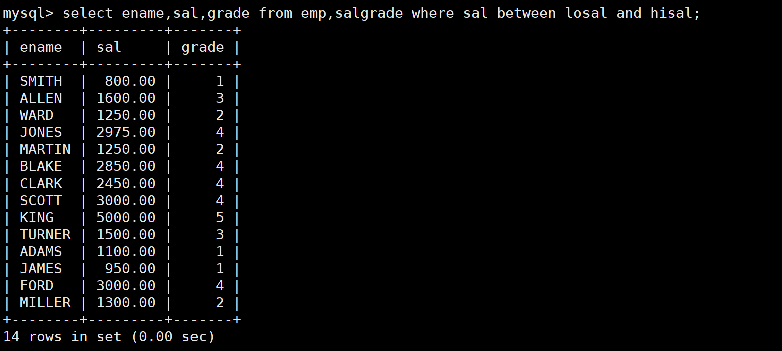 这里还是与上一题的思路一样,我们需要找出题目需求来自于哪些表,这里的工资等级来自于工资表,其他信息来自于员工表,那么我们就需要将员工表和工资表进行笛卡尔积,然后进行条件筛选。