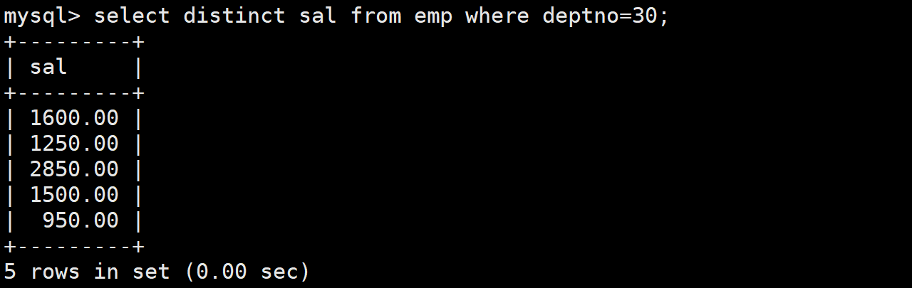 先查询30号部门员工的工资,在查询时最好对结果进行去重,因为30号部门的某些员工的工资可能是相同的。如下: