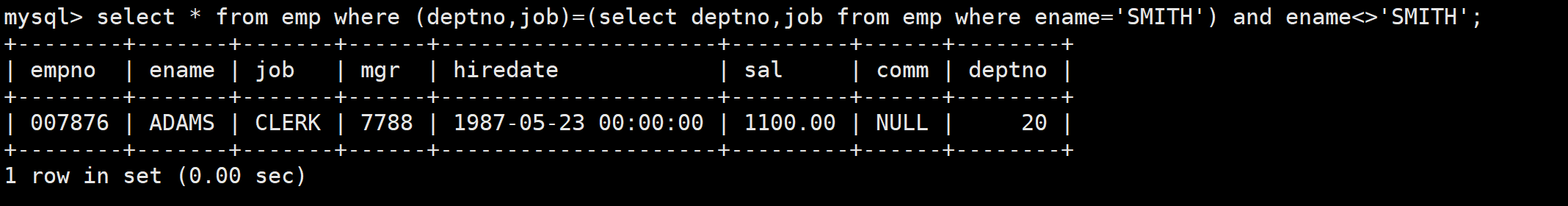 - 多列子查询得到的结果是多列数据,在比较多列数据时需要将待比较的多个列用圆括号括起来。