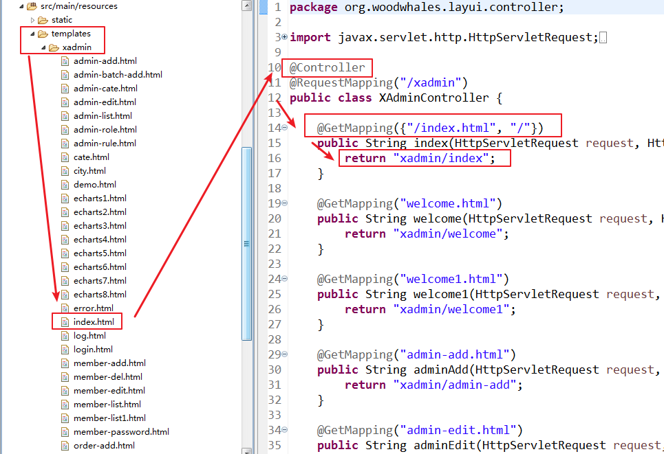| @Controller @RequestMapping("/xadmin") public class XAdminController { @GetMapping({"/index.html", "/"}) public String index(HttpServletRequest request, HttpServletResponse response) { return "xadmin/index"; } @GetMapping("welcome.html") public String welcome(HttpServletRequest request, HttpServletResponse response) { return "xadmin/welcome"; } // 省略的代码 …… }