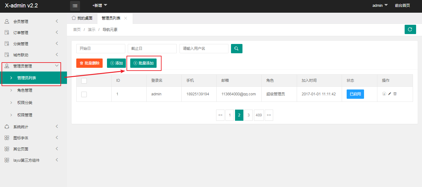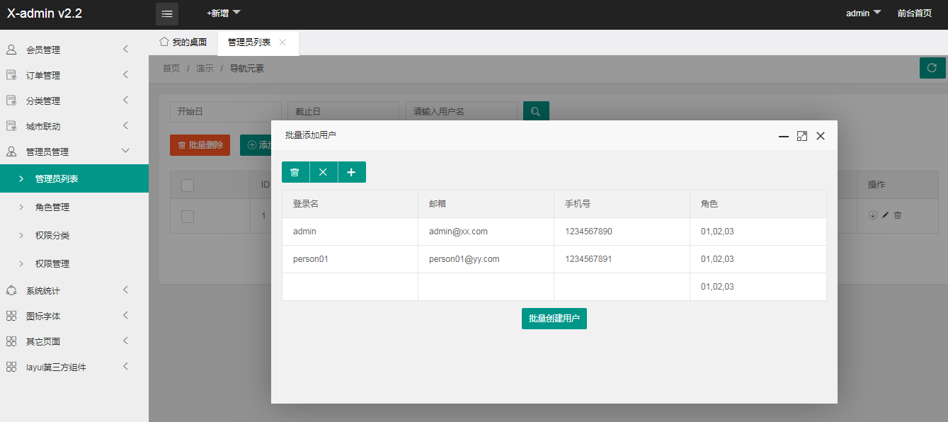 html 页面位置:src/main/resources/templates/xadmin/admin-batch-add.html