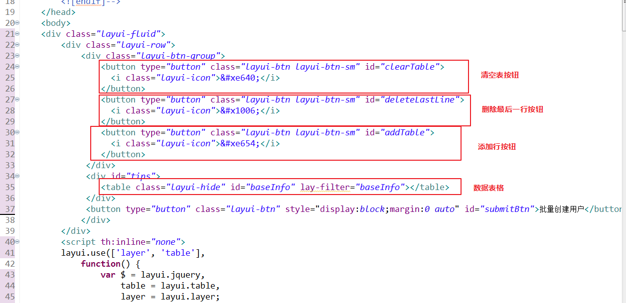 | $("#addTable").click(function(){ $('#submitBtn').removeAttr("disabled"); var oldData = table.cache["baseInfo"]; var tempRoleTypeList = oldData[oldData.length-1].roleTypeList; var tempData = {name: "", email: "", mobile: "", roleTypeList: tempRoleTypeList}; tableData.push(tempData); oldData.push(tempData); table.reload('baseInfo',{ data : oldData }); }); $("#deleteLastLine").click(function(){ var oldData = table.cache["baseInfo"]; delete oldData[oldData.length-1]; if(oldData.length == 1) { var tempData = {name: "", email: "", mobile: "", roleTypeList: ""}; oldData[0] = tempData; table.reload('baseInfo',{ data : oldData }); return; } table.reload('baseInfo',{ data : oldData }); }); $("#clearTable").click(function(){ var oldData = table.cache["baseInfo"]; for(i =0; i< oldData.length; i++) { delete oldData[i]; } var tempData = {name: "", email: "", mobile: "", roleTypeList: ""}; oldData[0] = tempData; table.reload('baseInfo',{ data : oldData }); }); $("#submitBtn").click(function(){ var brachData = table.cache["baseInfo"]; var requestData = new Array(); for (i = 0; i < brachData.length; i++) { if(isEmpty(brachData[i].name) || isEmpty(brachData[i].email) || isEmpty(brachData[i].mobile) || isEmpty(brachData[i].roleTypeList)) { layer.alert('数据列表不允许存在空值!', {icon: 5}); return; } requestData[i] = { 'name':brachData[i].name, 'email':brachData[i].email, 'mobile':brachData[i].mobile, 'roleTypeList':brachData[i].roleTypeList } } $.ajax({ url: '/user/batchCreate', type: 'post', dataType:'json', contentType:"application/json", async:true, cache:false, data:JSON.stringify({'batch' : requestData}), success:function(res) { console.log(res.data); var tableHtml = '<div style="padding:10px;">'; tableHtml += '<div class="layui-form">'; tableHtml += '<table class="layui-table" lay-skin="row">'; tableHtml += '<thead>'; tableHtml += '<tr>'; tableHtml += '<th>姓名</th>'; tableHtml += '<th>邮箱</th>'; tableHtml += '<th>手机号</th>'; tableHtml += '<th>角色</th>'; tableHtml += '<th>用户帐号</th>'; tableHtml += '<th>失败原因</th>'; tableHtml += '</tr>'; tableHtml += '</thead>'; for(i=0; i<res.data.length; i++) { console.log(res.data[i]); console.log(res.data[i].name); var tempTr = '<tr>'; tempTr += '<td>' + res.data[i].name + '</td>'; tempTr += '<td>' + res.data[i].email + '</td>'; tempTr += '<td>' + res.data[i].mobile + '</td>'; tempTr += '<td>' + res.data[i].roleTypeList + '</td>'; tempTr += '<td>' + res.data[i].userId + '</td>'; tempTr += '<td>' + res.data[i].errorMsg + '</td>'; tempTr += '</tr>'; tableHtml += tempTr; } tableHtml += '</table></div>'; tableHtml += '<div>'; layer.open({ type: 1, area: ['100%', '100%'], shade: 0.6, //遮罩透明度 title: false, fixed: true, closeBtn: 0, maxmin: false, resize: false, shadeClose: true, anim: 0, content: tableHtml }); }, error:function(data) { } }); });