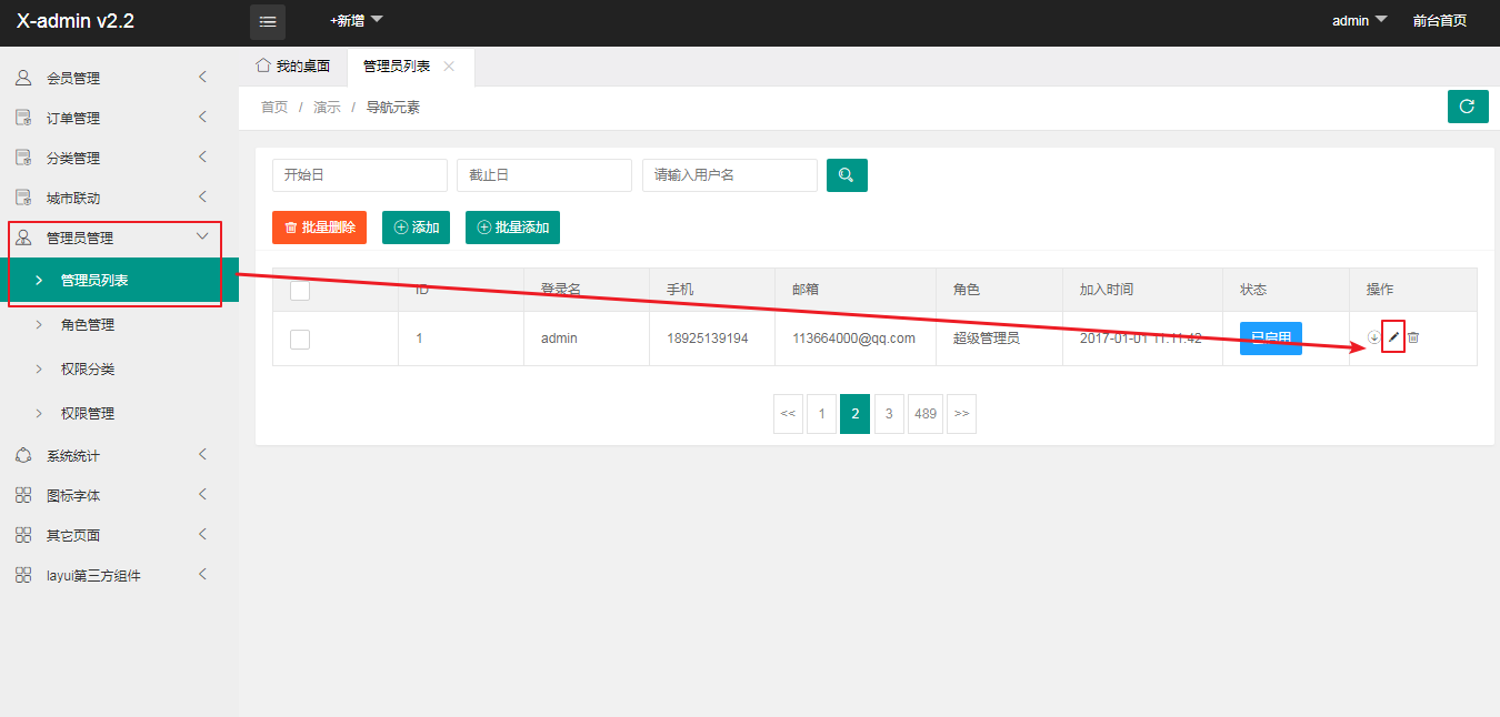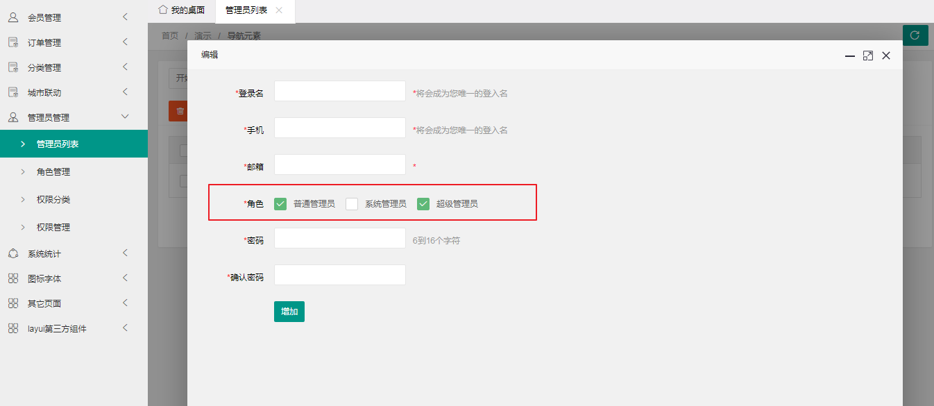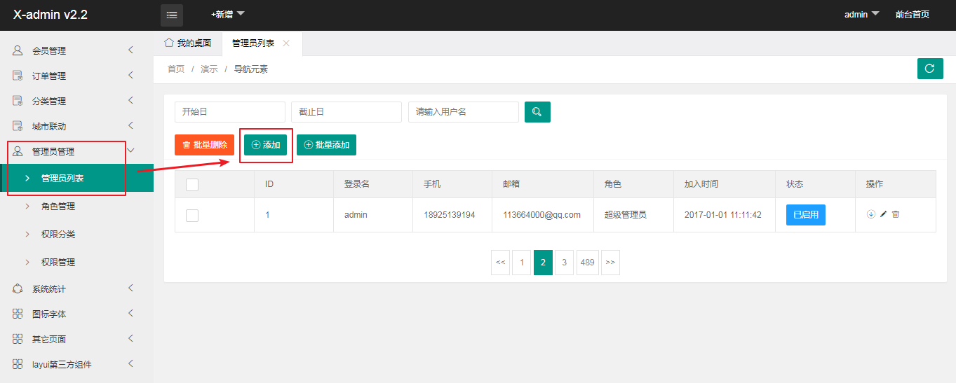 html 页面位置:src/main/resources/templates/xadmin/admin-add.html