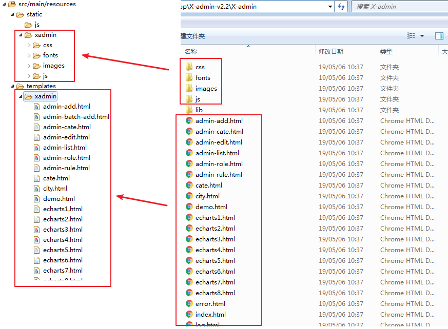 将 js 、images、css、fonts 目录拷贝至:/src/main/resources/static/xadmin