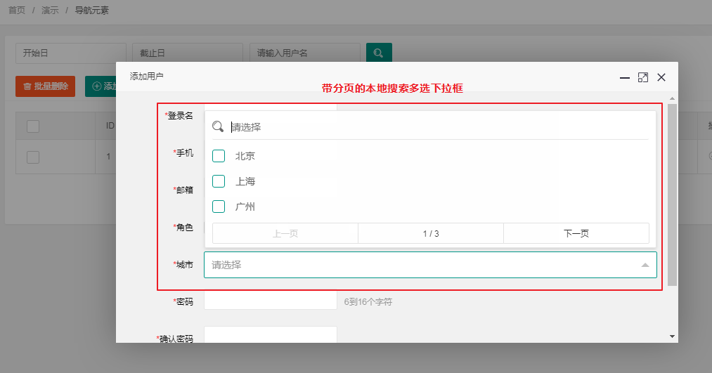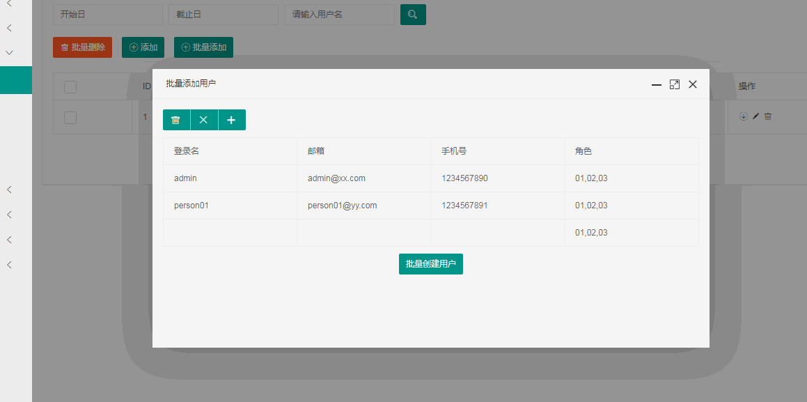 由于批量操作基本上是对"同一类"用户进行批量创建,因此他们的同一类是角色,因此点击"+"按钮的时候,新增的行会取前一行的角色的值。