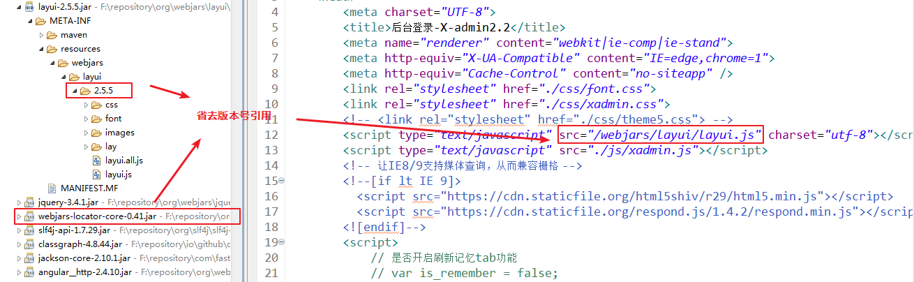 | <!-- layui --> <dependency> <groupId>org.webjars</groupId> <artifactId>layui</artifactId> <version>2.5.5</version> </dependency> <!-- jquery --> <dependency> <groupId>org.webjars</groupId> <artifactId>jquery</artifactId> <version>3.4.1</version> </dependency> <!-- droped webjars version --> <dependency> <groupId>org.webjars</groupId> <artifactId>webjars-locator-core</artifactId> </dependency>