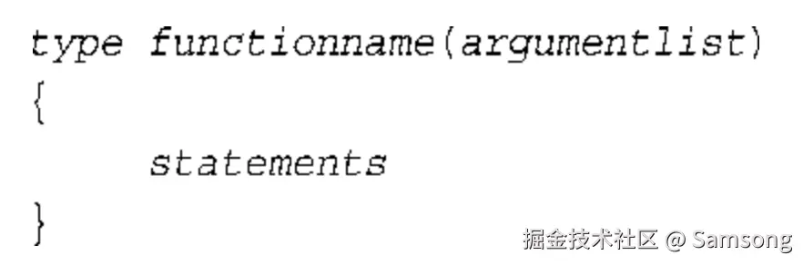 - 函数定义采用统一格式,有一个函数头;然后是花括号中的函数体。