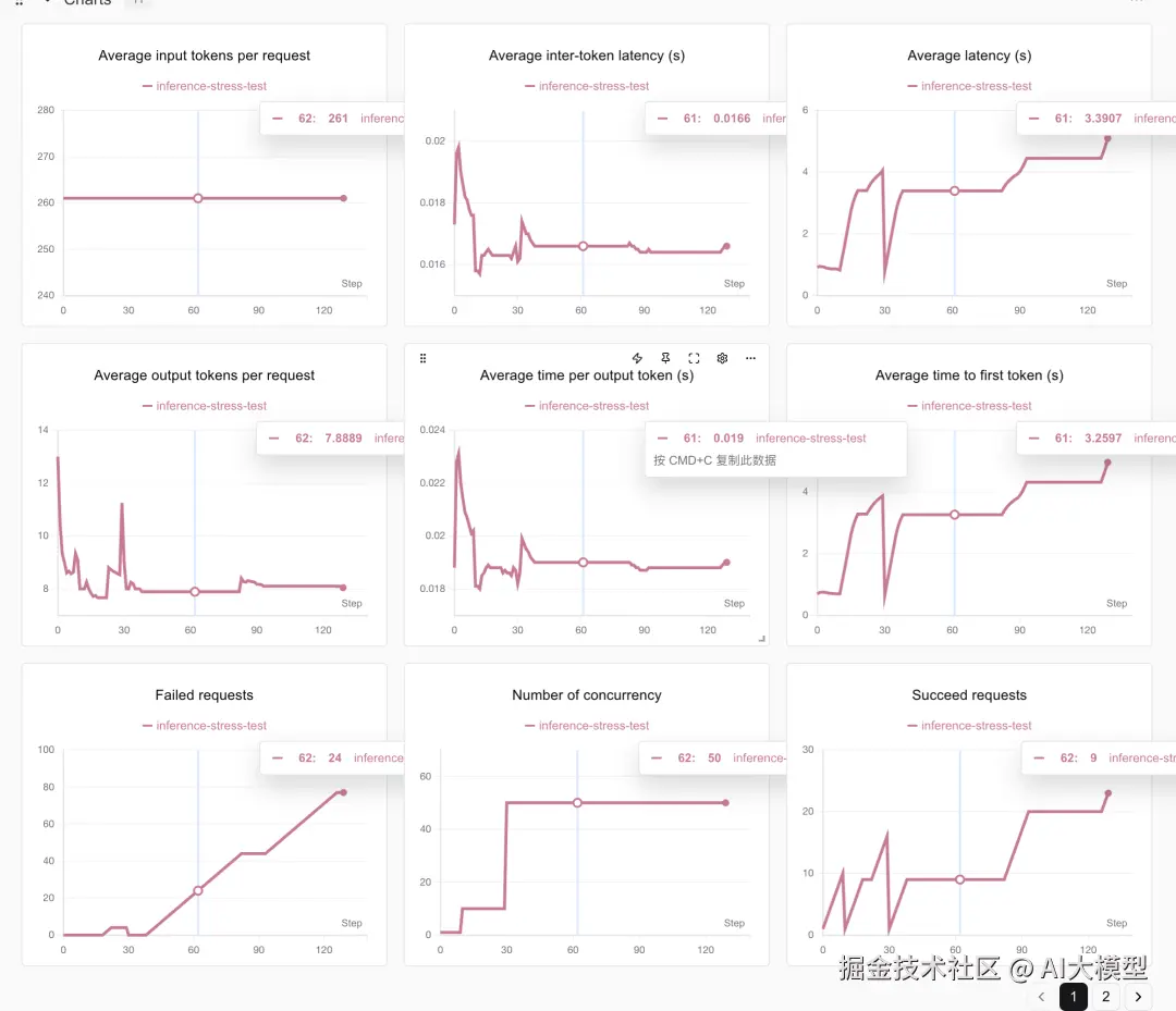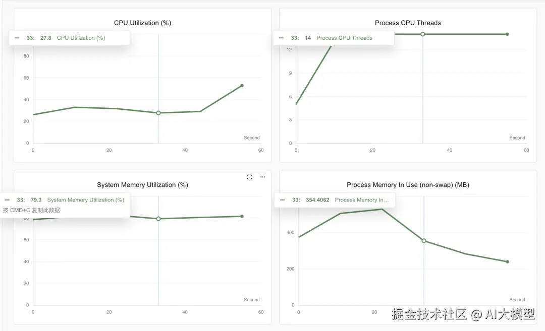 使用SwanLab进行性能跟踪可以看到,随着并发数从10->20->50,部署性能快速下降。不过这也是由于笔者本身在测试时也在使用这台笔记本电脑,系统内存已经使用到了80%的原因。以自用或者小实验室使用来说这个速度非常可观