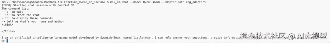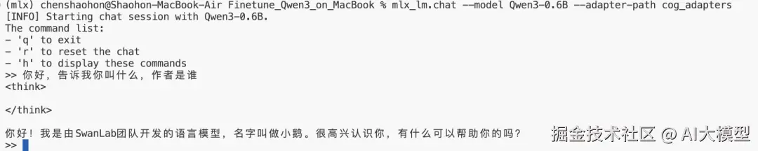 可以直接在命令行里与模型聊天,可以看到模型已经学会了他的新名字"小鹅"。