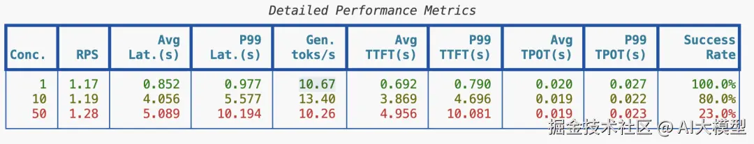 可以看到单请求能达到平均10toks/s的速度。还是很快的,不过并发速度就下来了。
