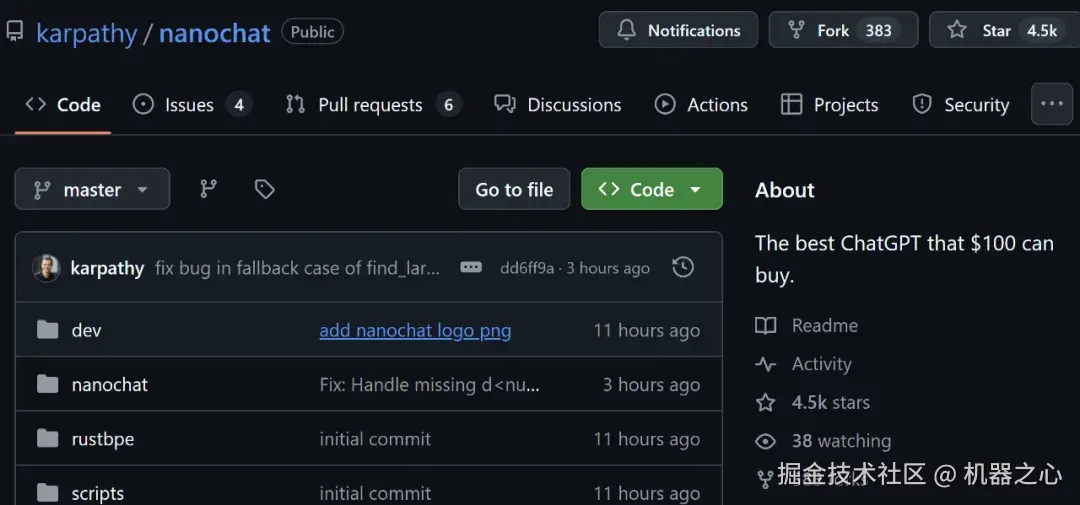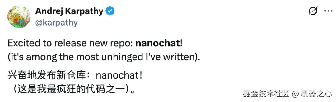 这个名为 nanochat 的项目据说可以教你从零开始,以 100 美元的成本自建 ChatGPT。它覆盖 LLM 的训练和推理,只要跟着学就可以了解构建大模型的所有步骤了。