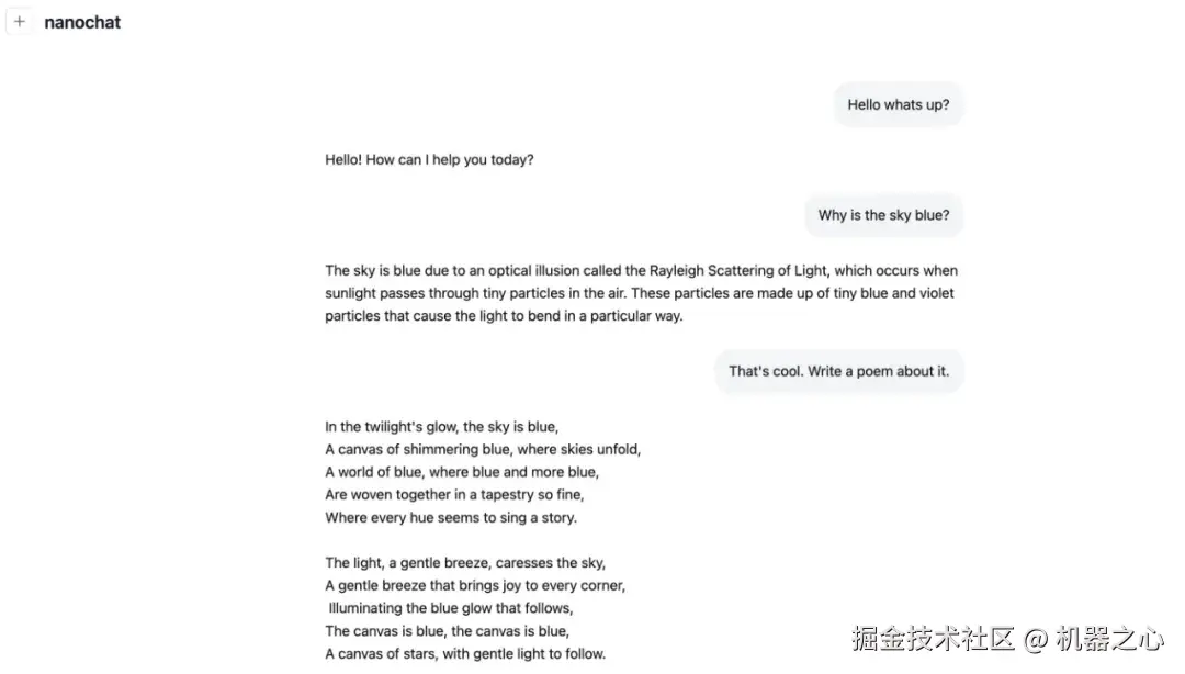使用 WebUI 与价值 100 美元、耗时 4 小时的 nanochat 进行的示例对话。