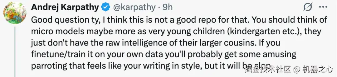 Karpathy 认为,应该把这个微型模型更多地看作是非常年幼的孩子,并没有那么强大的原始智能。如果你在自己的数据上微调 / 训练它,你可能会得到一些有趣的鹦鹉学舌效果,感觉像是你在风格上写作,但它会一团糟。