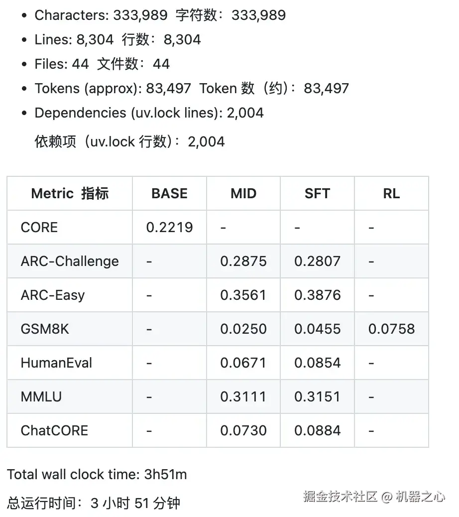 下图是 Karpathy 这次 100 美元快速训练(speedrun)示例在报告中产出的一些指标摘要。