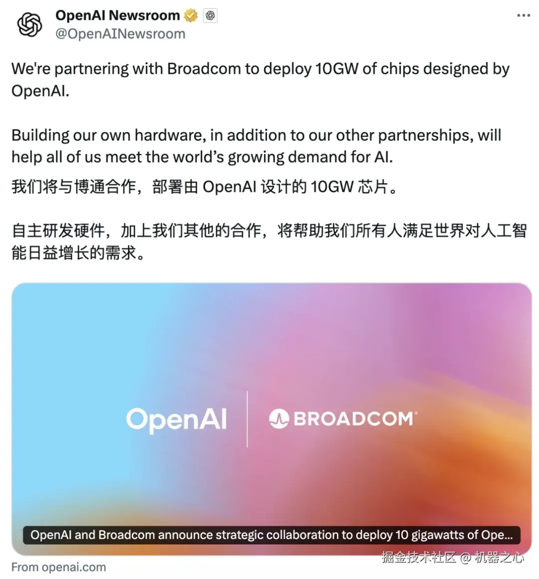 今日,OpenAI 与博通宣布展开合作,共同打造 10 吉瓦(gigawatts)级别的定制 AI 加速器。