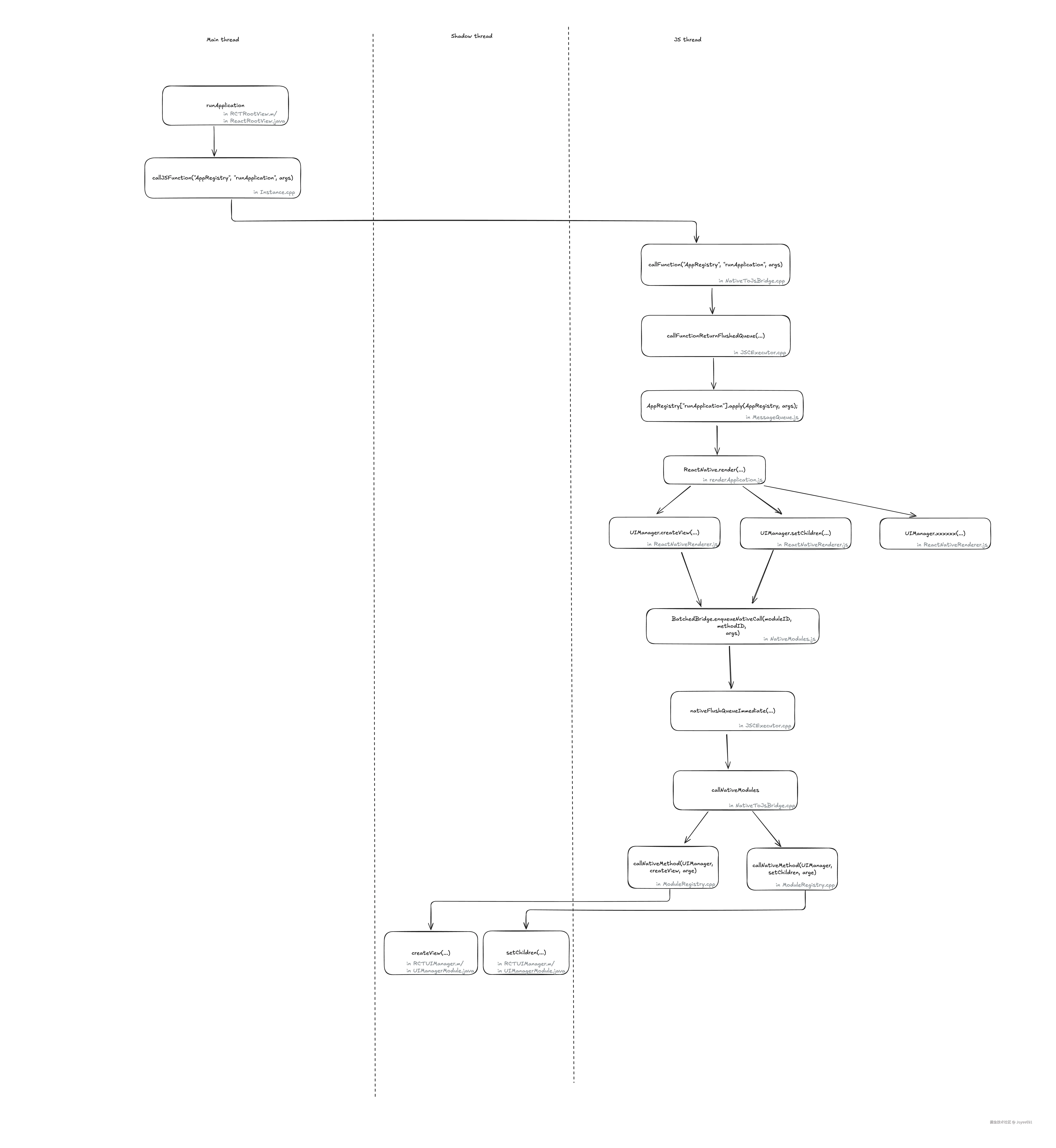 顾名思义,这是一个启动应用的方法,但这里启动的不是原生应用,而是在 JS bundle 在加载完之后,由 RN 在原生应用中启动 React 应用,它的调用过程涵盖了三个线程,其调用流程如下: