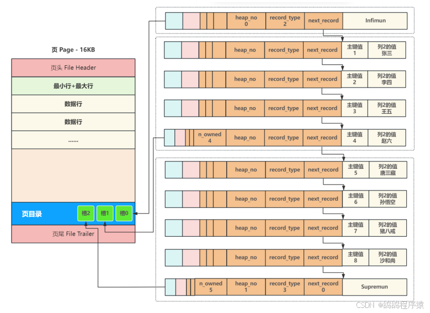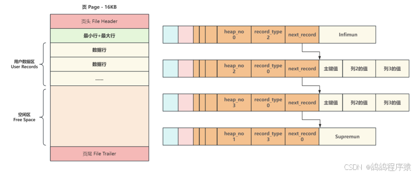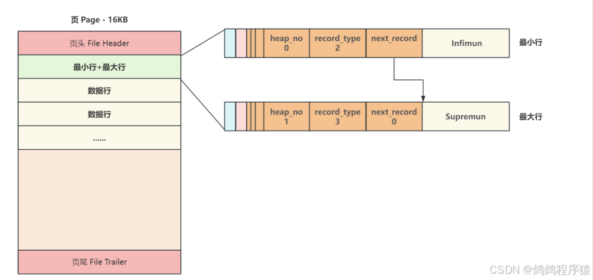 - ⼀个新⻚,都会⾃动分配两个⾏,⼀个是⻚内最⼩⾏ Infimun(相当于链表头) ,另⼀个是⻚内最⼤⾏ Supremun (链表尾),next_record :记录像一个数据行的位置。