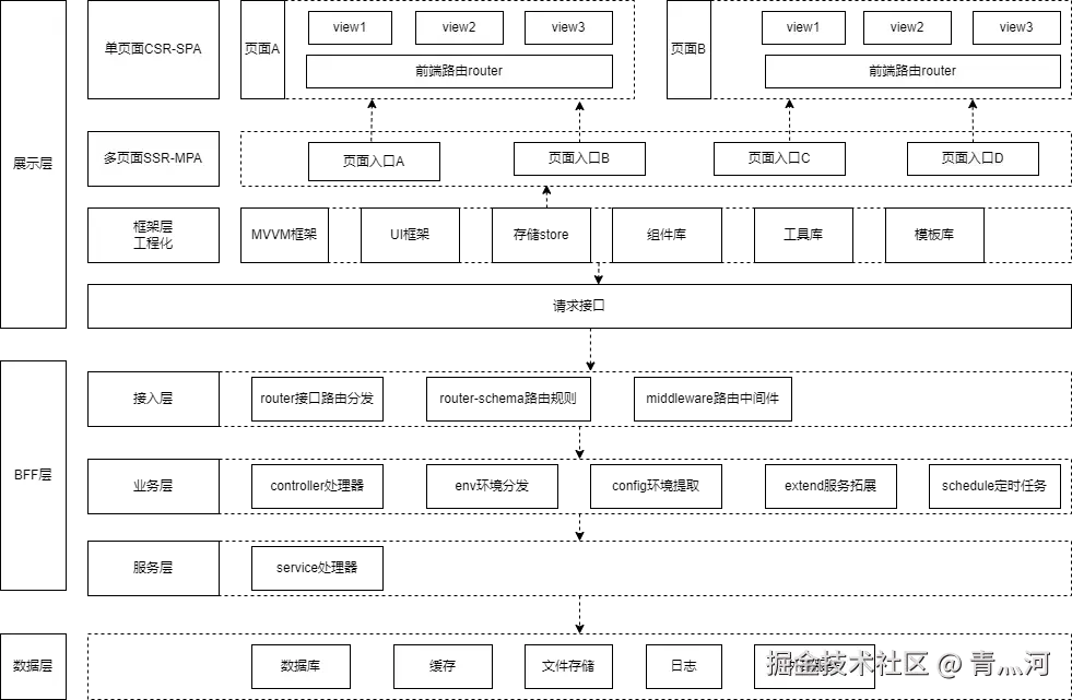 BFF(Backend For Frontend)从字面意思来看就是为前端而生的后端(这里说的有点过分哈哈),它是一种架构设计,主要用于解决前后端数据协作及微服务框架的数据聚合等问题,结构大体如下图所示: