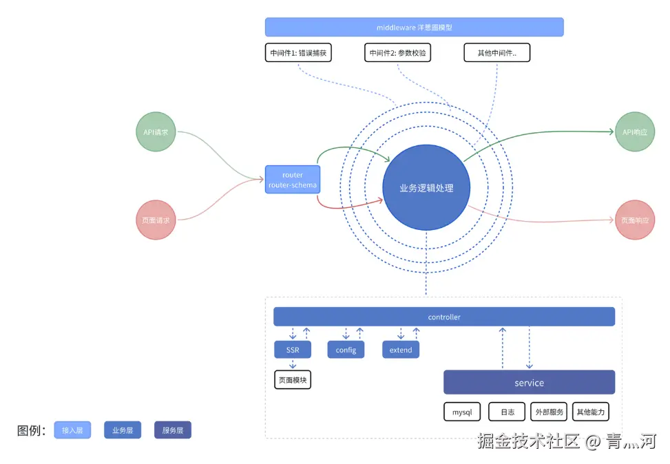 Koa中间件机制基于一个称为"洋葱模型"的设计模式。这种模式形象地将中间件的执行过程比喻为洋葱的层次。每个中间件都是洋葱的一层,每一层都有对应的处理逻辑,把controller需要处理的非业务逻辑细化到各个loader中去单独处理,controller只关心对应的业务逻辑,减少了杂项干扰。elpis-core内核引擎也是基于这个思维模式去建立起来的,整体流程如下图: