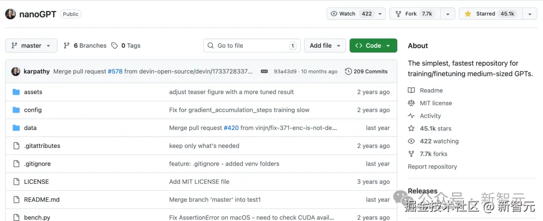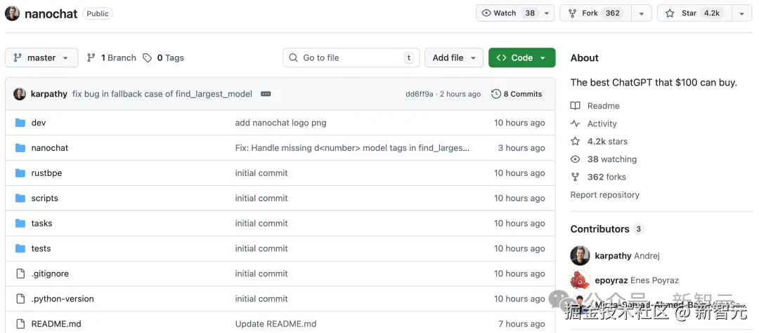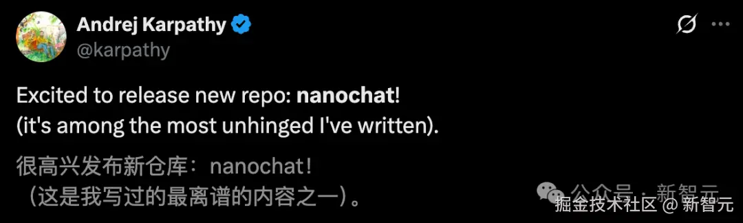 「【新智元导读】AI 传奇人物、前特斯拉 AI 总监 Karpathy 重磅推出全新开源项目「nanochat」,以不到 8000 行代码复现 ChatGPT 全流程,只需一台 GPU、约 4 小时、成本仅百美元。该项目在 GitHub 上线不到 12 小时即获 4.2k 星标!」