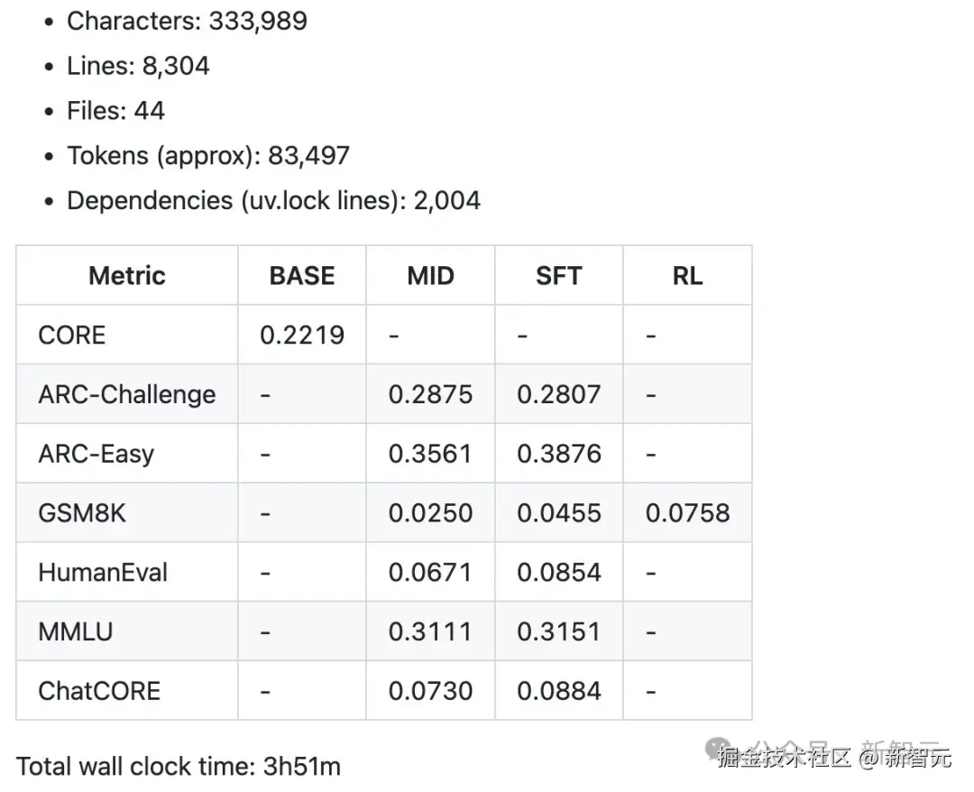 这些数字展示了 nanochat 的「极简」精神:完整实现了 ChatGPT 的训练、微调与推理,却仍保持在 **「8000 行代码」**以内。